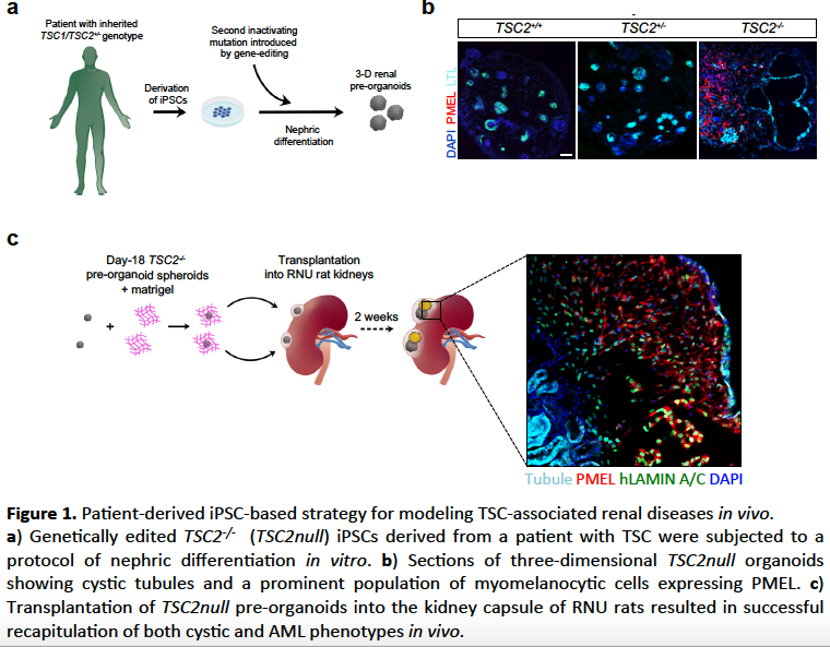 One of the areas of interest in our laboratory is the study of diseases that cause tissue degeneration. Tuberous Sclerosis Complex (TSC) is a multi-system incurable disease affecting approximately 1:7000 live births, that is caused by inactivating mutations in the genes Tuberous Sclerosis Complex 1 or 2 (TSC1, TSC2, respectively)1. Loss of either gene, profoundly alters cell behavior, causing uncontrolled tissue growth and tumor formation in the organs affected2. In the kidney, loss of TSC1 or TSC2 can cause a variety of renal diseases, depending on the cell type affected3,4. The two most common renal diseases observed in patients with TSC are benign tumors known as angiomyolipoma that can cause spontaneous life-threatening bleedings, and epithelial cysts that can alter nephron activity. While the mechanisms of cystic disease are better understood thanks to the existence of animal models that reproduce them, the cellular and molecular mechanisms driving angiomyolipoma remain unknown. This is largely due to the fact that there are no appropriate experimental ways to replicate these tumors in the laboratory.