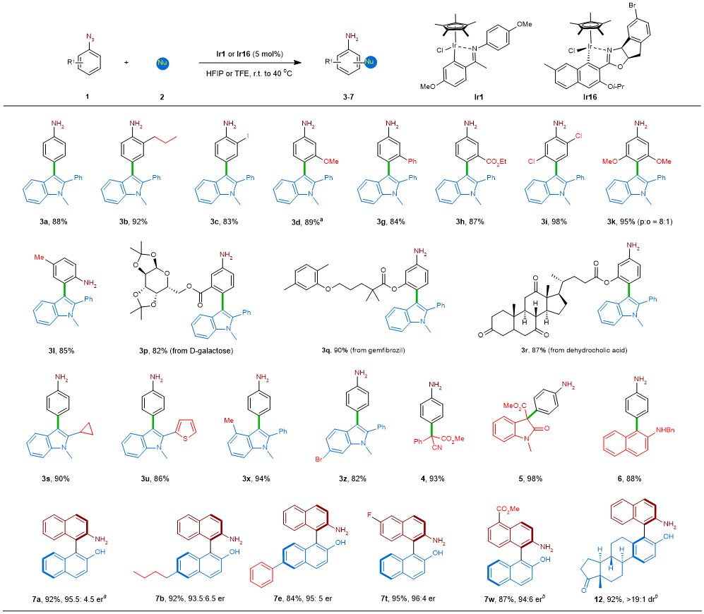 We first examined the reaction of phenyl azide with indole as a nucleophiles in the presence of metal complexes. A survey of commonly employed transition metal complexes found that commercially available [Cp*IrCl2]2 furnished the desired product 3a in 8% yield. When cyclometalated Cp*–iridium complex Ir1 with a simple imino ligand was used, the desired product was formed in 88% yield. The generality of the reaction with regard to different aryl azides and nucleophiles was subsequently studied, and most of the substrates were converted to their corresponding products with good yields. By modifying the achiral catalyst Ir1, we eventually discovered that the chiral oxazoline-derived catalyst Ir16 can effectively promote the catalytic atroposelective synthesis of NOBIN witht readily available 2-azidonaphthalene and 2-naphthol serving as a nitrene precursor and a nucleophile, respectively.