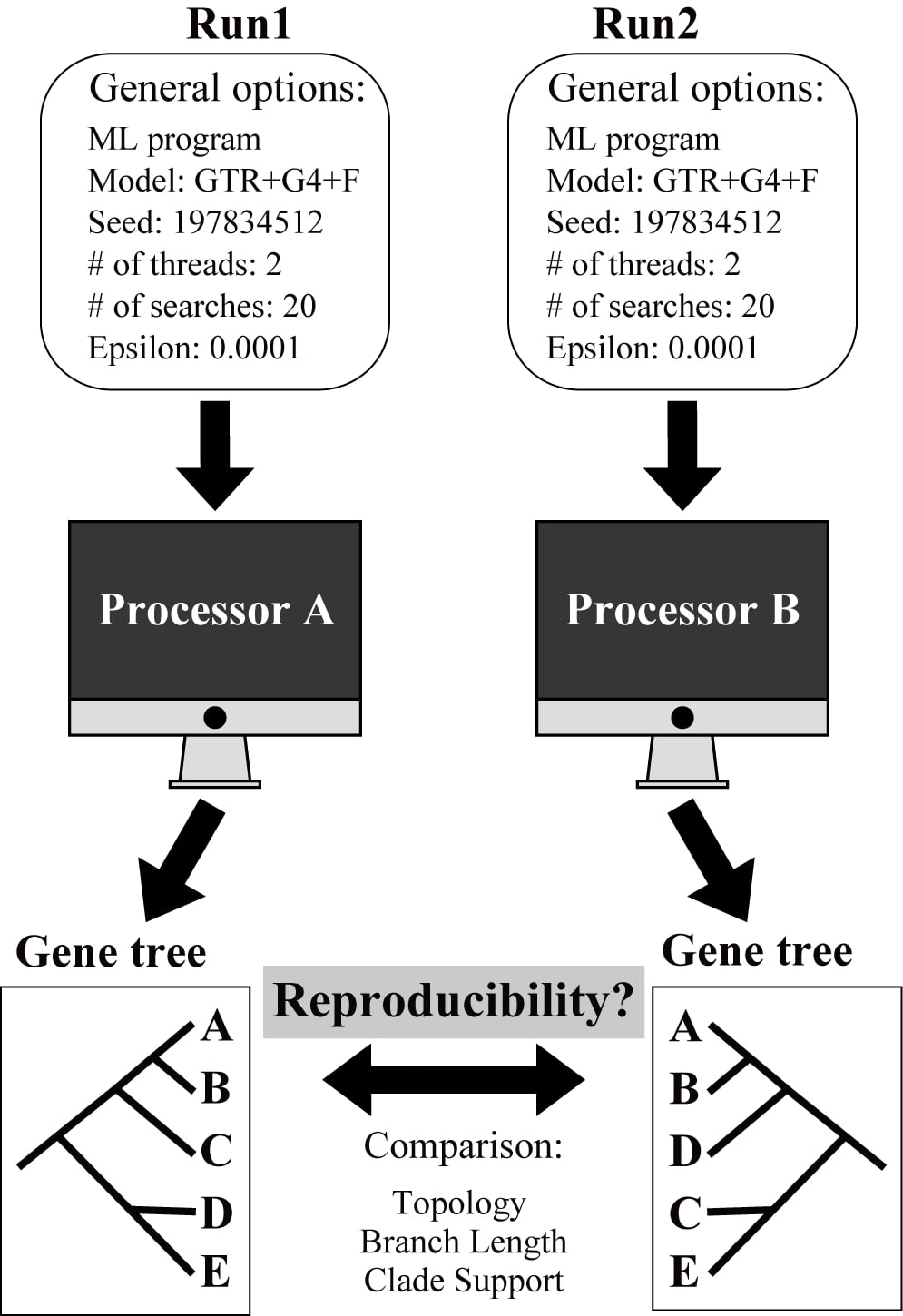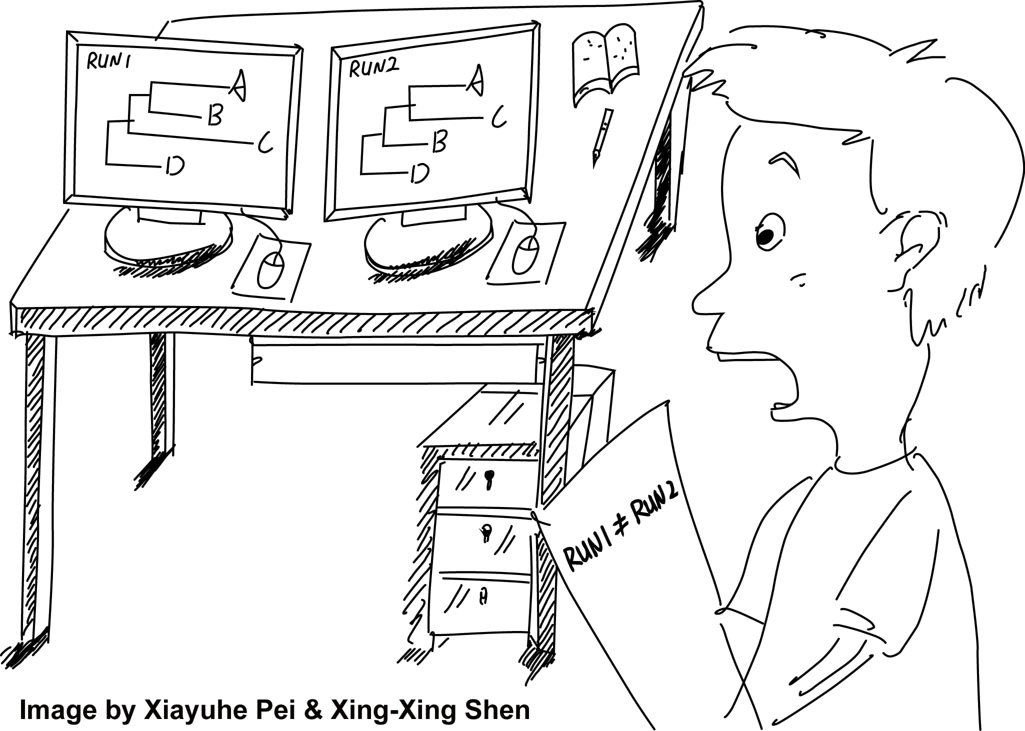 In a summer morning in 2019, I went to the Rokas Lab at Vanderbilt University as usual, in which I had wonderful life and fruitful research achievements, and submitted several jobs to run phylogenetic analyses using the IQ-TREE software on Vanderbilt’s supercomputer, known as ACCRE. When all my analyses were finished, I found that I had accidentally ran some analyses twice (both had the identical parameter settings including random starting seed number). But to my amazement, I realized that these identical runs produced phylogenetic trees that were topologically different from each other. How could this happen? And why did it happen?