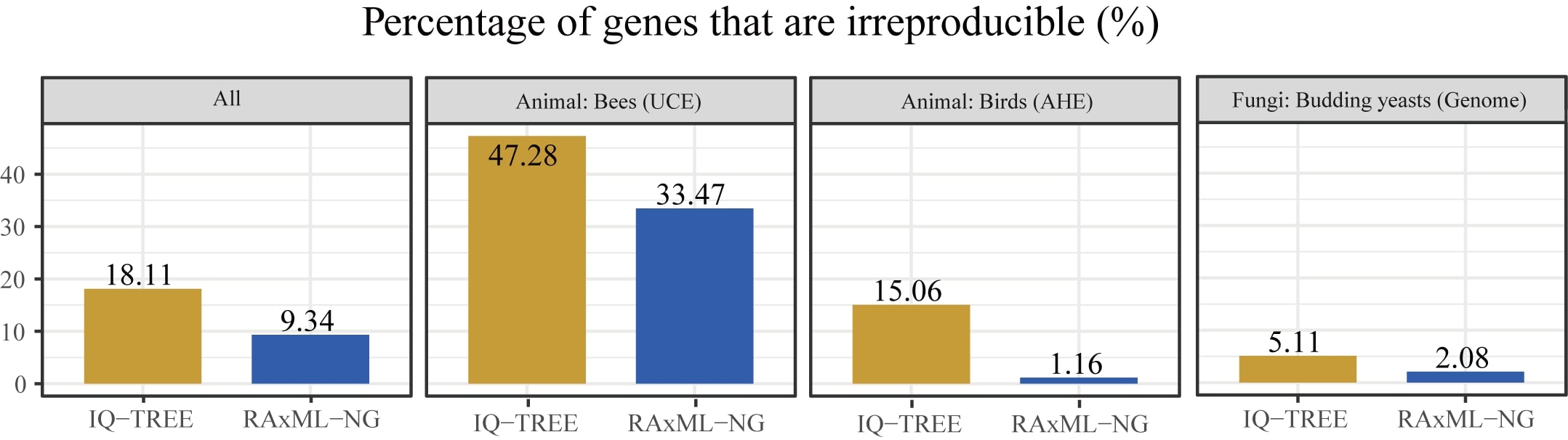 As a result, we found that 3,515 / 19,414 (18.11%) IQ-TREE-inferred gene trees and 1,813 / 19,414 (9.34%) RAxML-NG-inferred gene trees were topologically irreproducible. In addition, we found that irreproducibility was much higher (25.2%) in the eight datasets constructed using ultra-conserved element (UCE) capture 4, Anchored Hybrid Enriched (AHE) capture 5, or conserved exon capture 6 approaches, which tend to generate short alignments of highly conserved gene regions, than in the remaining seven studies (8.5%). Interestingly, we found that using 3 or more threads contributes to 2-fold increase in irreproducibility in IQ-TREE but not in RAxML-NG.