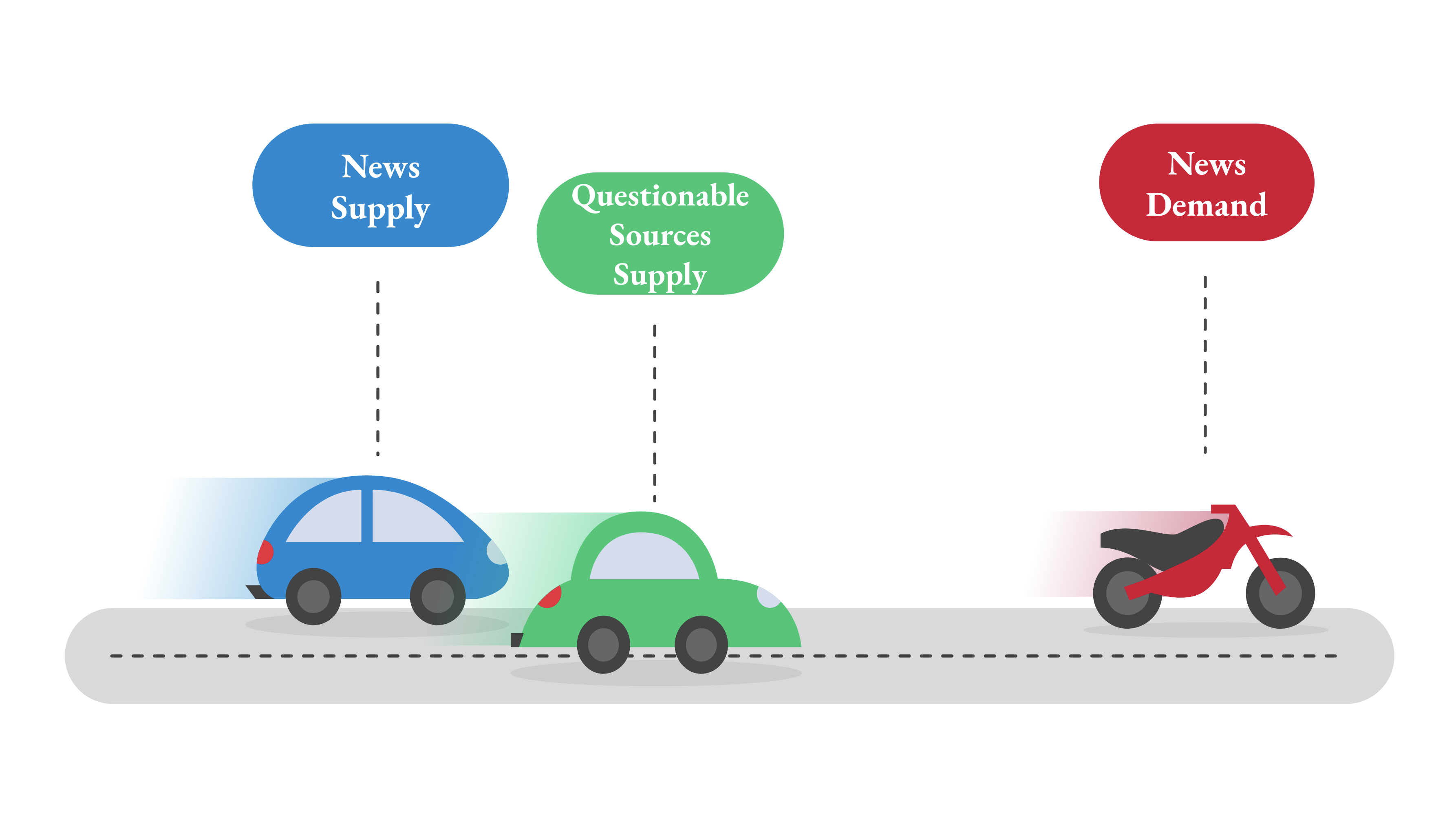 If we think about the infosphere as a market for news, it is natural to analyse its supply-demand behaviour. We learned some peculiar features of this trade with a simple modelling strategy. A linear modelling scheme was effective in almost all cases, which means that supply and demand direct relation can be quantified. In particular, the news production of a given day shows a strong dependence on the previous days' supply. This sort of resistance to change is usually referred to as an ``inertial'' effect. The model also allowed us to measure the ``memory'' of the process and the causality relation. The memory size (2 to 4 days) indicates that it does not matter if a topic was important one week ago, but it does if it was important yesterday. The causality analysis showed that the demand often drags the dynamics while the supply tries to follow it. But how well does it follow? What happens if supply is lagging behind? Here is where questionable sources come into play.
