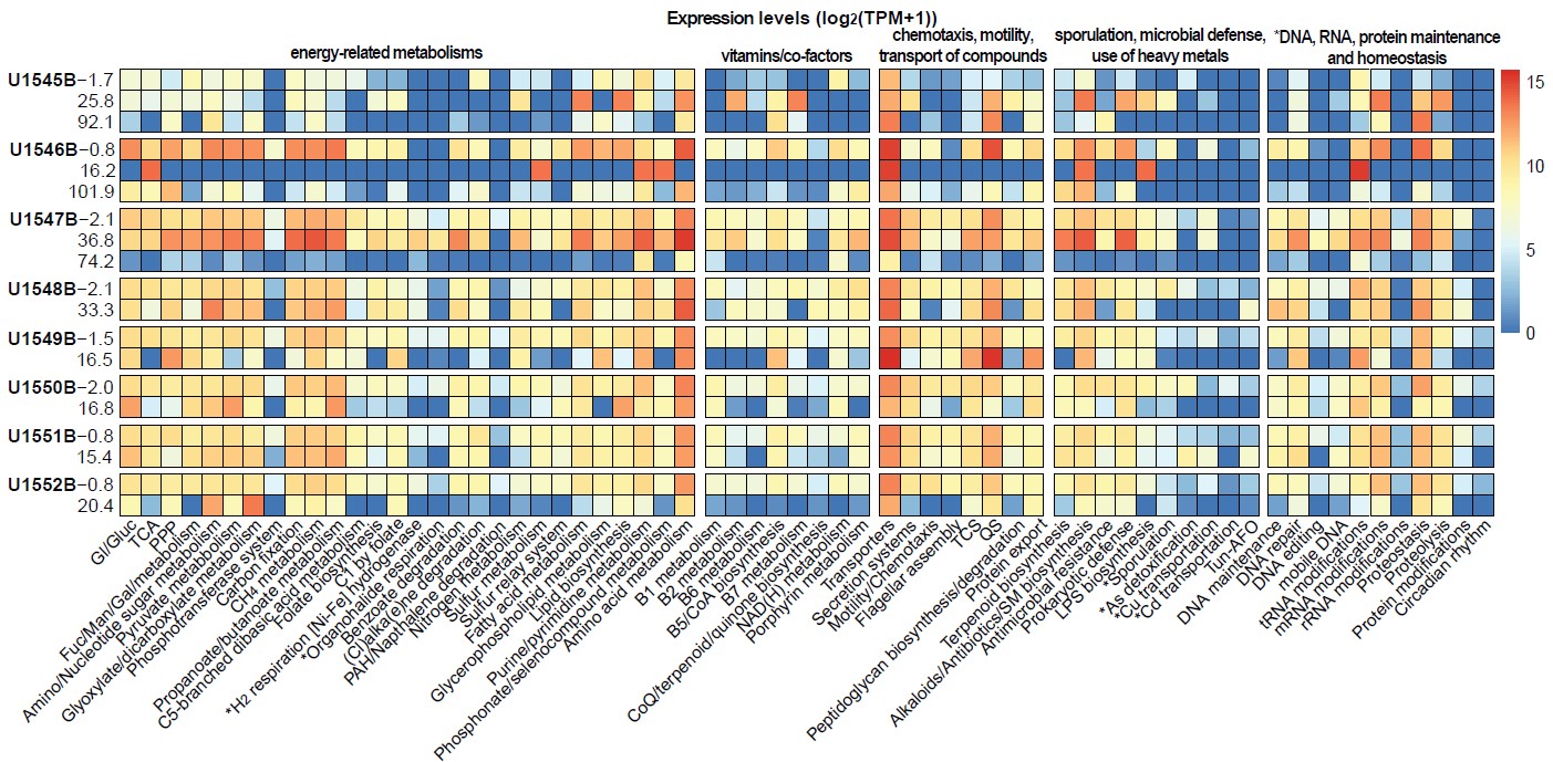 Figure 1. Prokaryotic metabolic and cellular processes identified at subsurface sediments from the eight sites (Y-axis) drilled in Guaymas Basin.