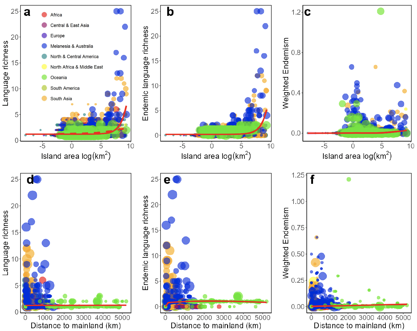 One way that languages differ from species is in their patterns of endangerment. Biodiversity loss affects all parts of the world, but islands have been particularly severely affected. For example, a fifth of the world’s bird species occur on islands, but 90% of recent bird extinctions have been of island endemic species6. Global linguistic diversity is undergoing a crisis of loss that is as severe as the threat to biodiversity, with more than a third of the world’s languages endangered, and potentially 1500 languages lost by the end of the century7. Many island languages have been lost, particularly due to the disastrous effects of colonisation. For example, the ten languages of the Great Adamanese language family fell silent after colonization devastated the indigenous inhabitants of the Andaman Islands, with the last remaining language spoken by only a few elders. Our analysis shows that island endemic languages do not have significantly higher levels of endangerment than their mainland counterparts. However, because islands hold such a disproportionately large share of the global language diversity, they will play a crucial role in safeguarding linguistic diversity. Islands are not only cradles of linguistic diversity, but also arks carrying languages diversity forward into the future.