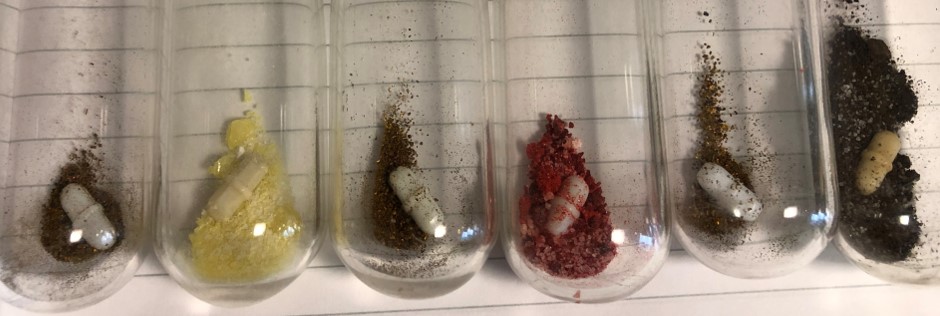 Conrad’s reaction flasks charged with metallocenes and reducing agents (left-right: potassium graphite (KC8); manganese(II) precursor; KC8; iron(II) precursor; KC8; cobalt(II) precursor.