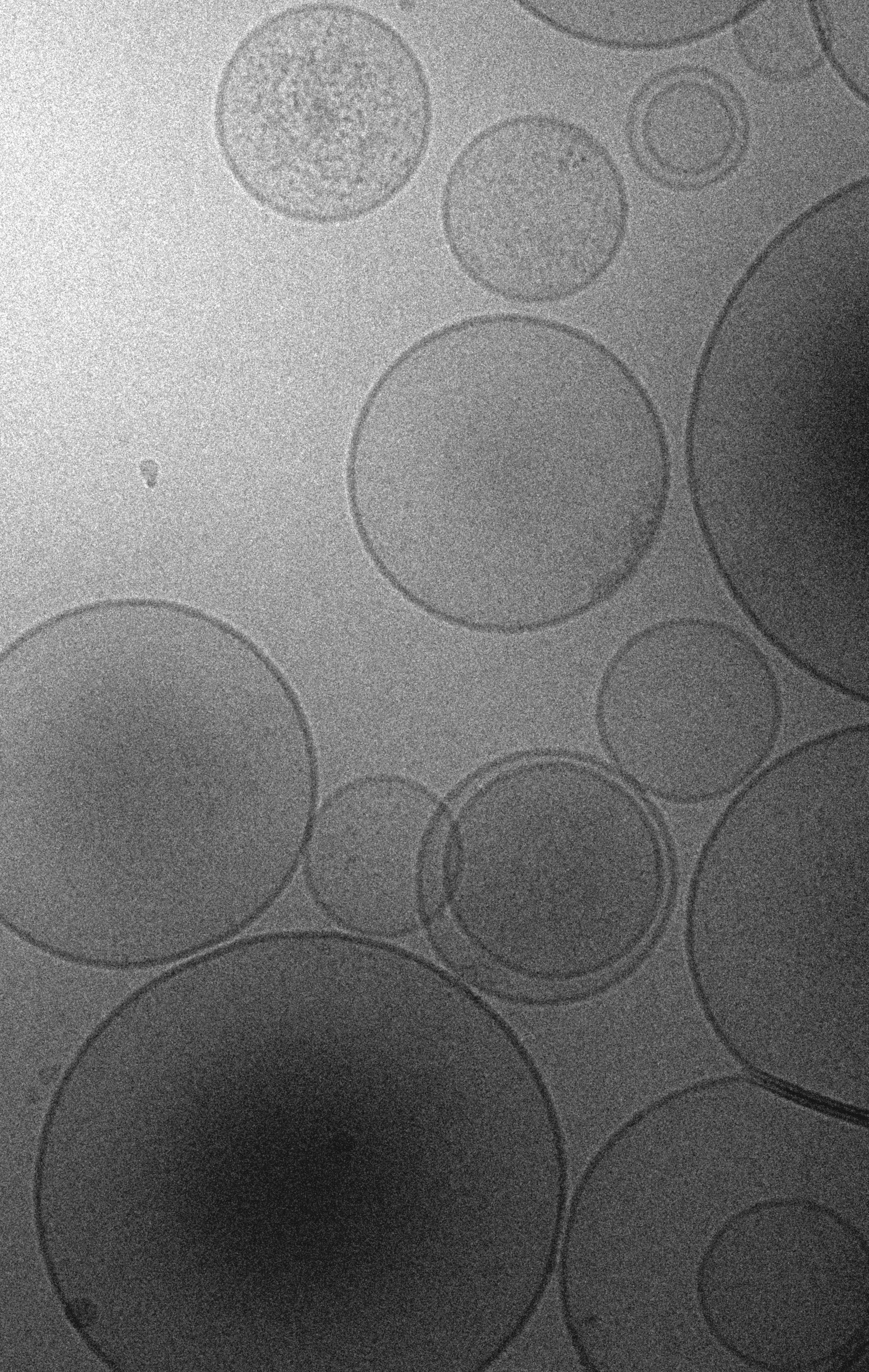 Figure 1. Cryogenic electron microscopy photomicrograph of EVs isolated from brain tissue using the method described in D’Acunzo et al., 2022. Note the presence of small granular EVs (exosomes), larger electron-lucent EVs (microvesicles), and double-membraned EVs (mitovesicles).