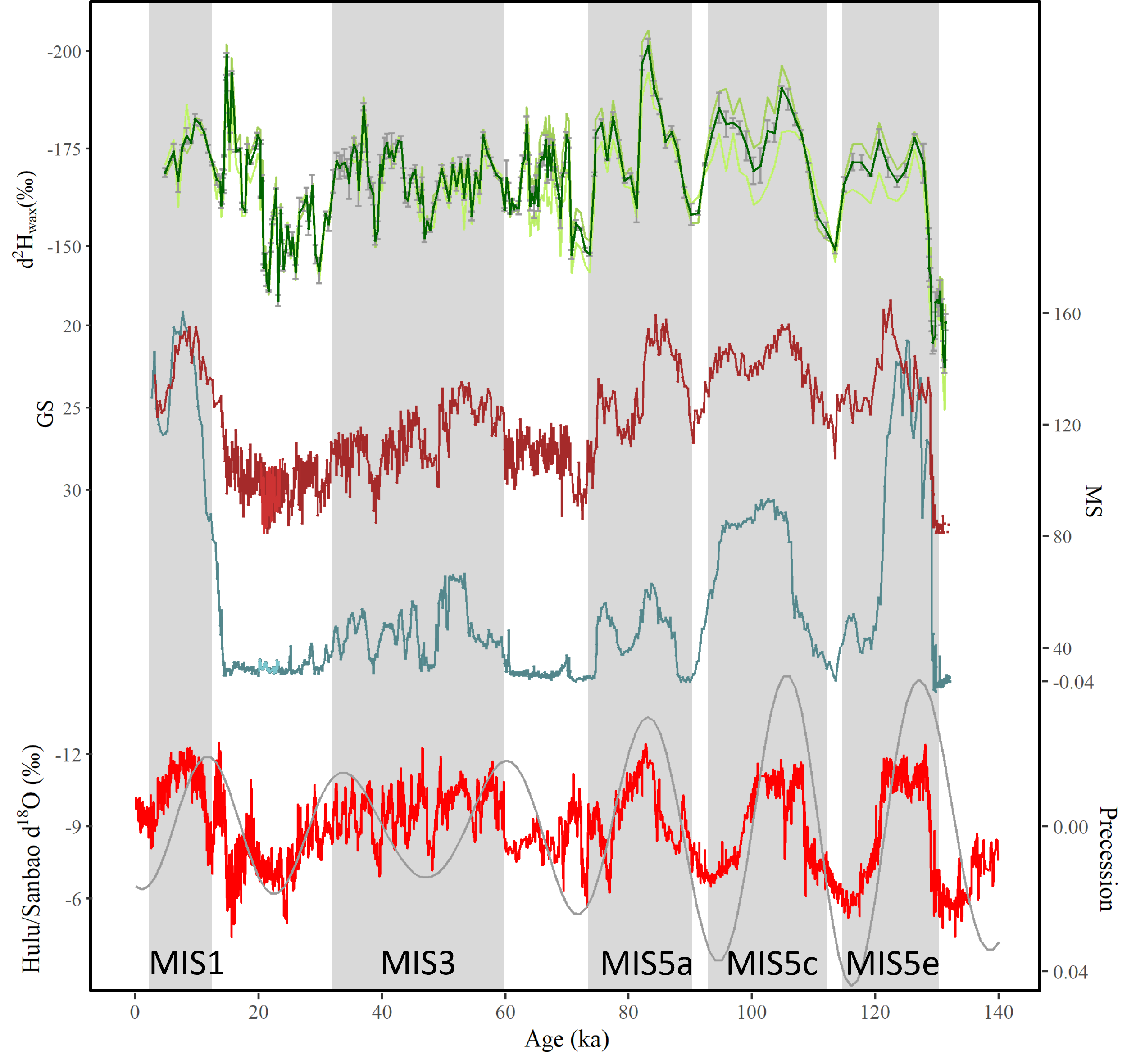 - Variations in δ2Hwax follow the precessional cycle of speleothem δ18O, which is different from the glacial-interglacial changes in magnetic susceptibility in the same loess section (Fig. 3).