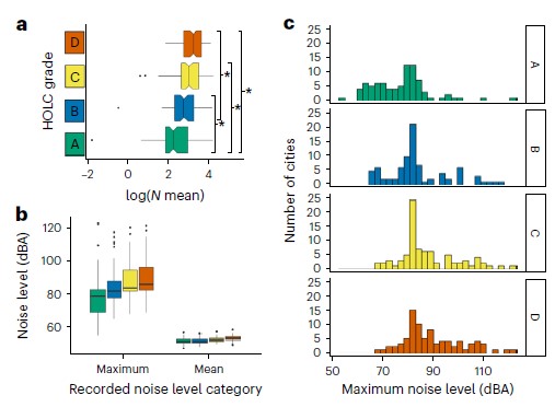 Our research shows a clear signal of inequitable noise exposure. Across 83 U.S. cities, grade D neighborhoods had over 10 times higher maximum noise levels than Grade A neighborhoods, and HOLC grades predicted urban noise pollution more than population size. Notably, grade D neighborhoods often exceeded 90 dB noise levels known to cause hearing damage, physical pain, and sociopsychological stress in humans, while grade A neighborhoods almost always had maximum noise levels below this limit. Moreover, grade A neighborhoods frequently had maximum noise levels below 70 dB, the EPA’s recommended upper noise limit to avoid human health impacts, while grade D neighborhoods were almost always above this 70 dB limit.