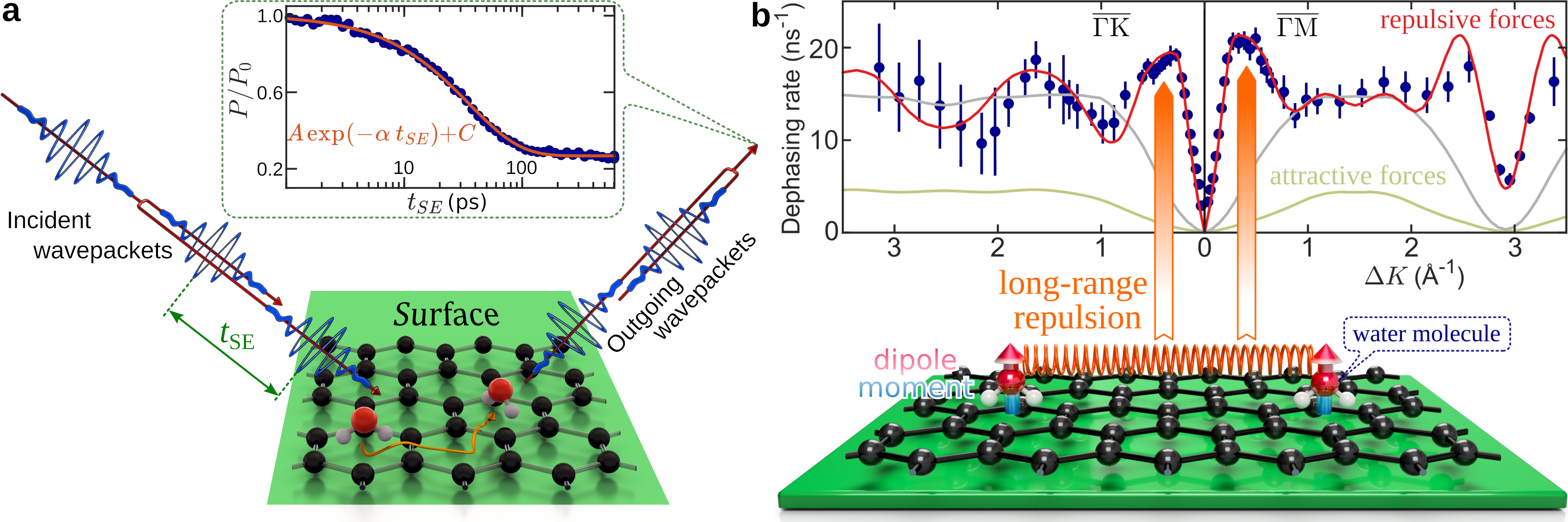We attribute these forces to dipolar interactions, arising from structural hindrance of water reorientation by the adsorption geometry: See the water dipole, illustrated by the blue/red arrow in the bottom panel of Figure 2b. The repulsive nature of these forces is confirmed by kinetic Monte-Carlo simulations which reproduce the steep rise of the experimental data at 0.5 Å-1 (highlighted by the orange arrows in Figure 2b). The latter is a characteristic feature of inter-molecular repulsion. Attractive forces on the other hand, suppress the jump rate (green line) while for no interactions (grey line) the molecules move independently.