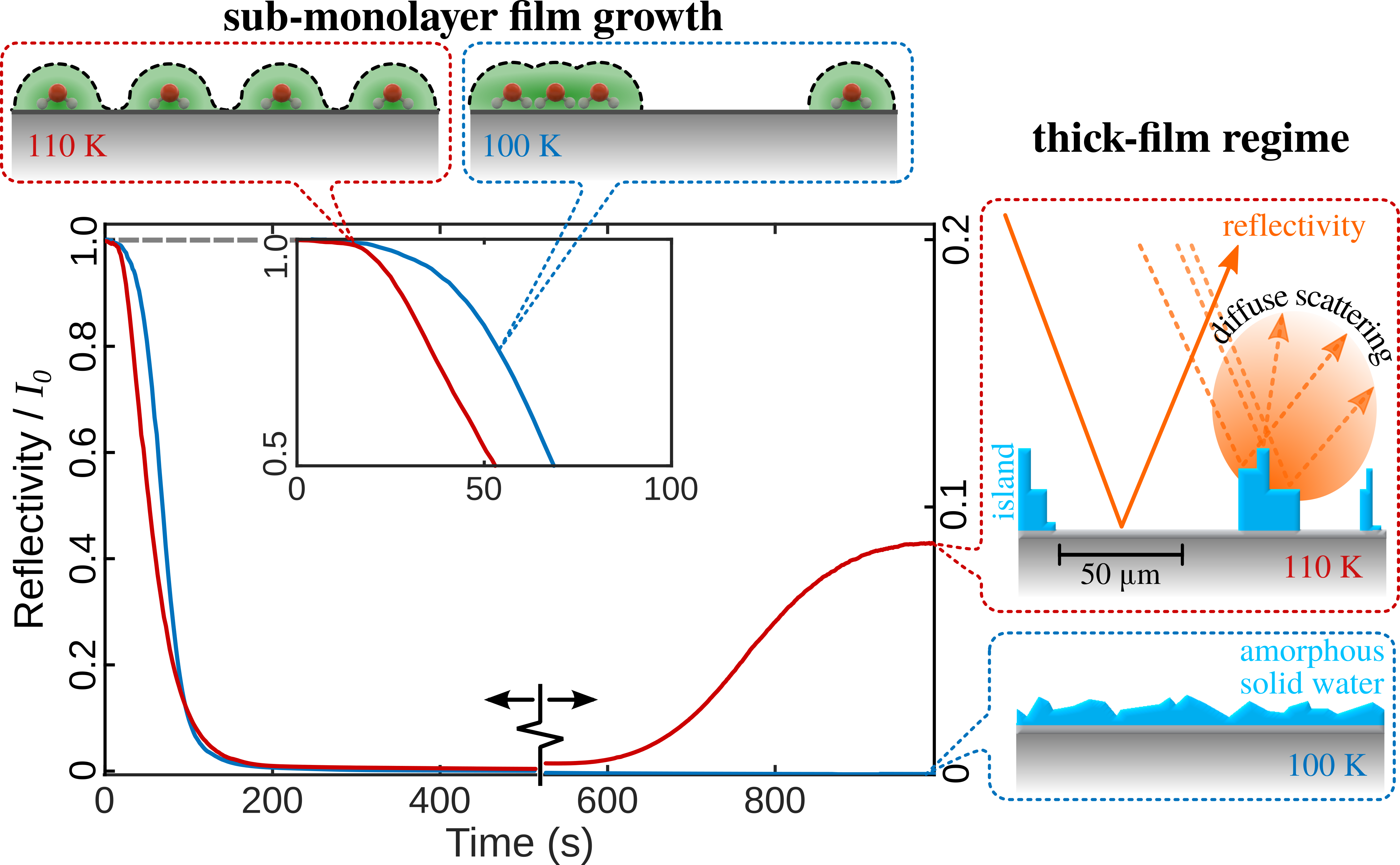 As soon as we started to put water down on a graphene surface in our experiments, we realised that the behaviour was very different to our previous study. We also saw fundamental differences with existing studies of water, which reported attractive forces and clustering[3,5]. Figure 1 shows such a measurement, where we monitor the intensity of the reflected helium beam, while the cold graphene surface is exposed to an increasing amount of water. The reflected intensity comes from the graphene surface, while water or ice forms a disordered arrangement and thus almost no reflected intensity is registered from ice-covered areas. Preparing thick water films with the graphene surface at 100 K this way, completely suppresses the helium reflectivity. However, upon heating the surface, we realised that there exists a certain temperature range where the reflected intensity recovered after some time: The ice-covered areas became smaller, leaving the graphene substrate behind.