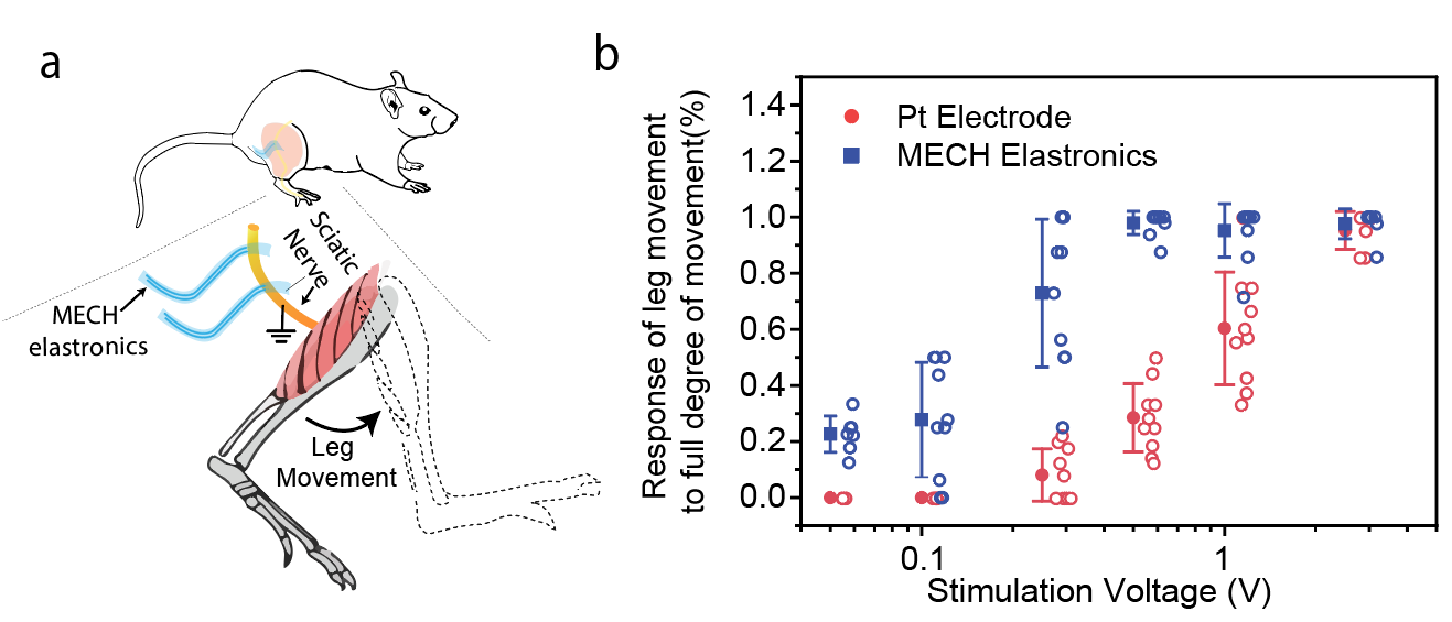 In our work just published in Nature Biomedical Engineering, we address this challenge by developing a jelly-like electronic device, i.e. hydrogel-based stretchable microelectrode array for neuromodulation. We demonstrated the capability of controlling the leg and toe movements in living mice at lower voltages compared to conventional platinum wire electrodes. The soft nature of our implanted stretchable thin-film microelectronics was shown to provide a stable neural interface and excellent long-term biocompatibility with minimal immune response.