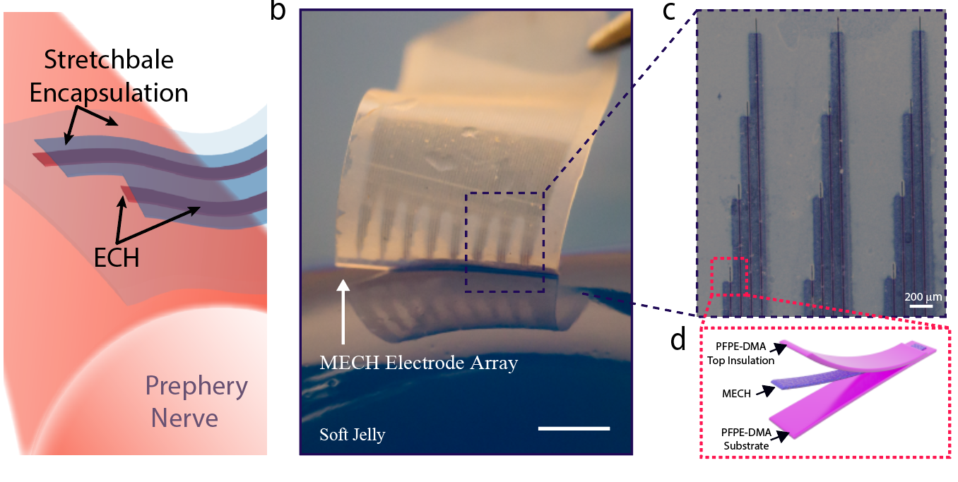 At that time, a conducting polymer PEDOT: PSS based soft stretchable conductor was developed in our group [3]. However, the conductor cannot be directly applied for implantation, because it contained toxic ionic liquids. In order to remove the ionic liquid, we soaked it in water multiple times. Surprisingly, not only the ionic liquid was removed, the PEDOT:PSS anisotropically swelled in out of the plane direction and formed a highly electrically conductive hydrogel. Using the anisotropic swelling property, we developed a micropatterning technique, which allowed us to pattern the conductive hydrogel into microelectrodes with feature size of 20 mm. In parallel and together with Dr. Jia Liu, we developed a photolithographically process for patterning a stretchable perfluorinated polymer, PFPE-DMA. The layer-by-layer photolithography patterning process allowed us to make a soft and stretchable microelectrode array, including the electrodes and interconnects (Figure 1). Besides reducing the mechanical mismatch, another advantage of using hydrogel as electrodes as well as the interconnects is that it also lowers the interfacial impedance. The low impedance allows us to electrically stimulate periphery nerve with lower voltage compared with conventional electrode material such as platinum as shown in Figure 2. This could lower the voltage constraint on designing power system implantable electronics in the future.