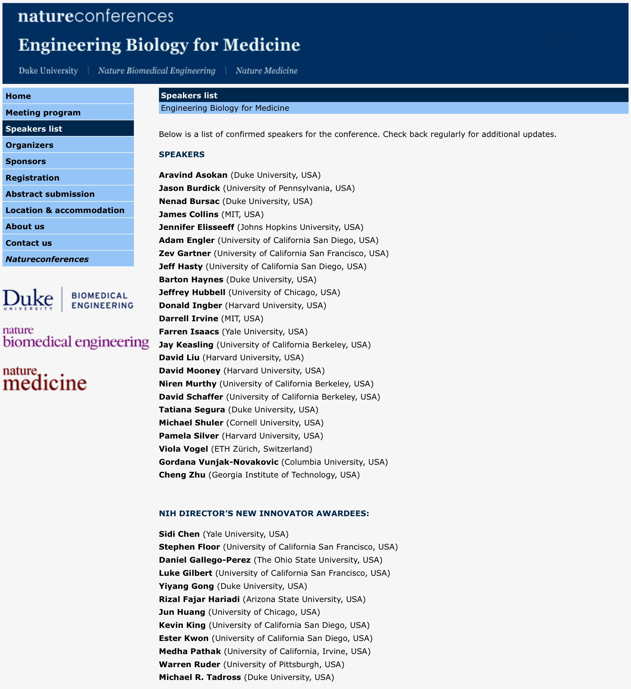 Join us in Durham, NC, on Sunday May 19 to Wednesday May 22, 2019. We can guarantee that you will come back home with plenty of new ideas for your research, and that you will enjoy interacting with pioneers who are developing technologies for biomedical discovery or to advance medicine. See our list of speakers (also in the screenshot below) and our conference program.