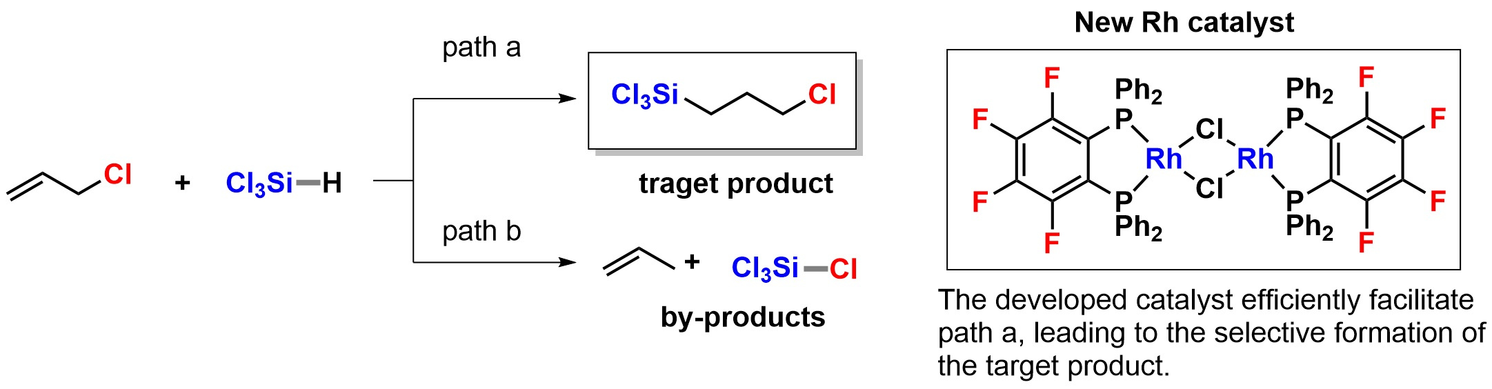 Thus, chloropropylsilane is now industrially synthesised on the order of several thousand tons per year via a simple hydrosilylation reaction of allyl chloride with HSiCl3 catalysed by conventional Pt catalysts. However, the relatively low selectivity (70 – 80%) of the reaction is a severe drawback. In our study, we present a hydrosilylation reaction of allyl chloride with trichlorosilane using a Rh(I) catalyst to form chloropropylsilane with 99% selectivity (Fig. 2).