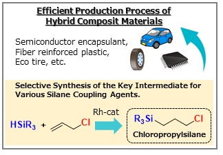 Our method allows the highly selective synthesis of chloropropylsilane, the raw material for silane coupling agents at the laboratory level. As a result, the process of purifying by-products is greatly simplified, making it possible to reduce manufacturing costs. Furthermore, it is expected that using this catalyst high-performance composite materials, such as eco-tires, semiconductor encapsulants and fibre-reinforced plastics can be supplied at lower cost.