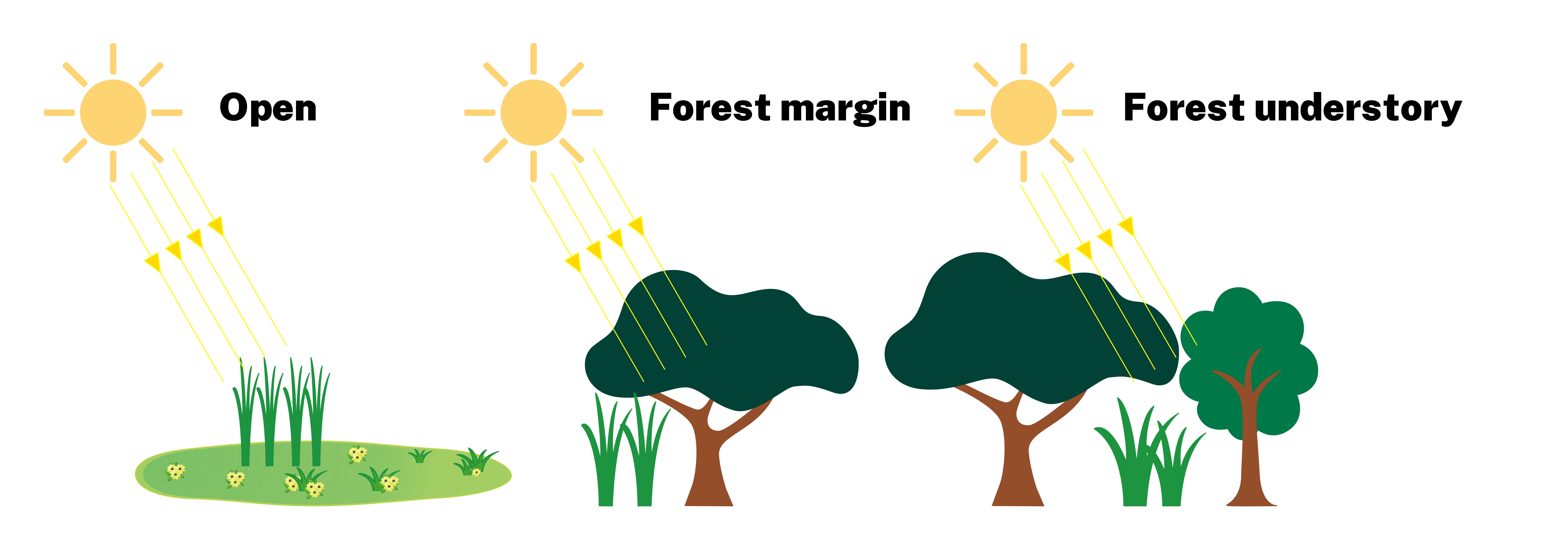 Fig. 1. A diagram depicting the size and shape of herbaceous plants in different habitats shape by solar radiation. From left to right are images corresponding to open habitat, forest margin and forest understory, respectively. Leaves become larger and wider, showing the effects of solar radiation on leaf photomorphogenesis. Credit: Jianguo Gao.