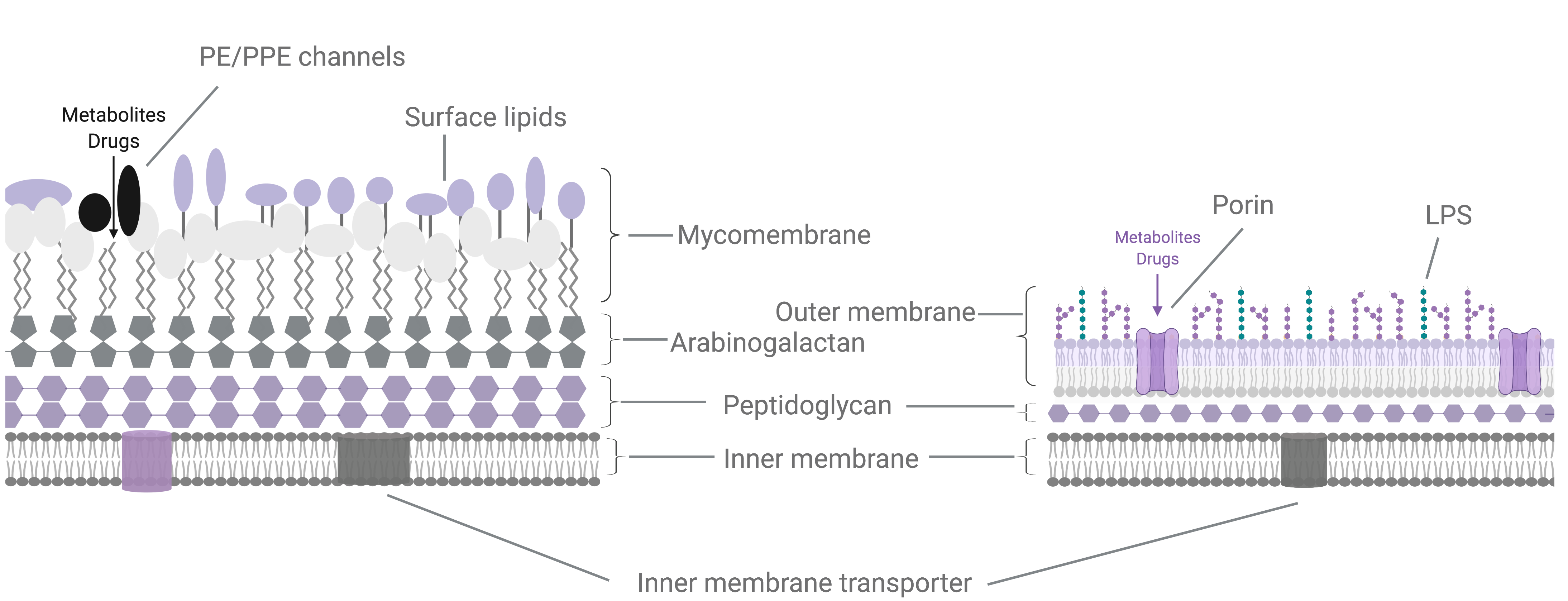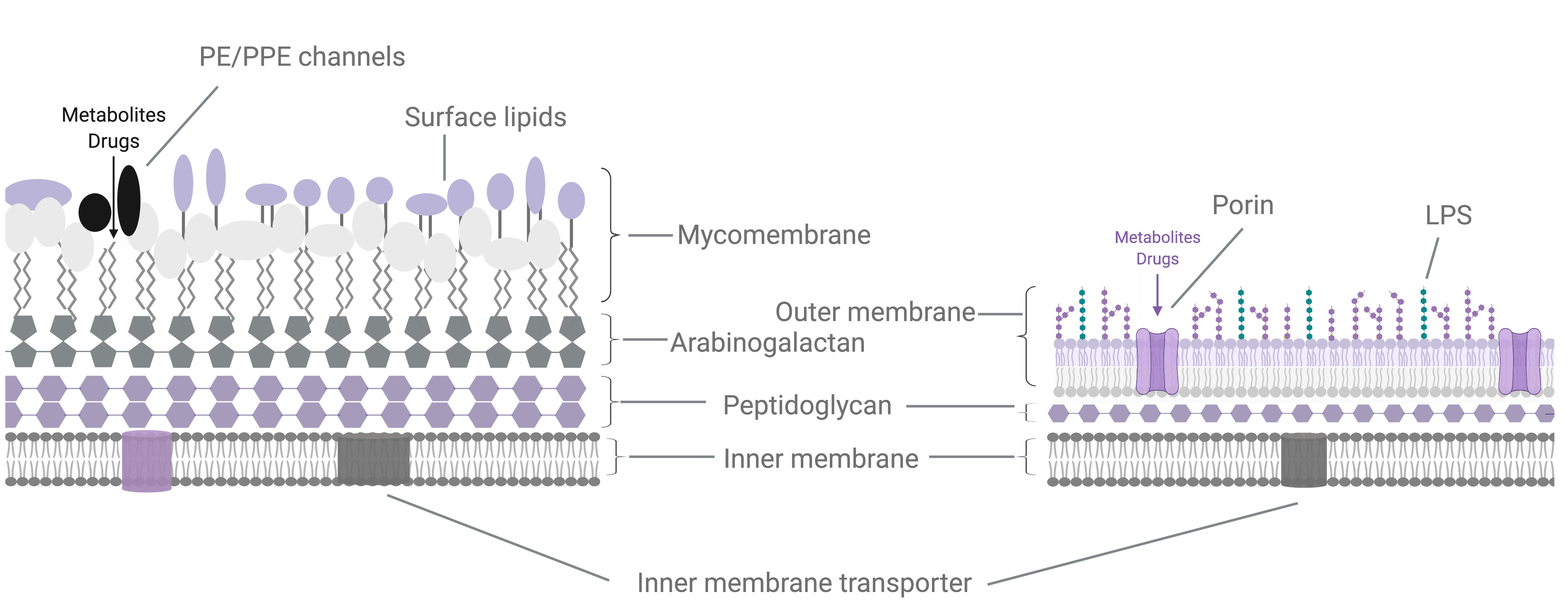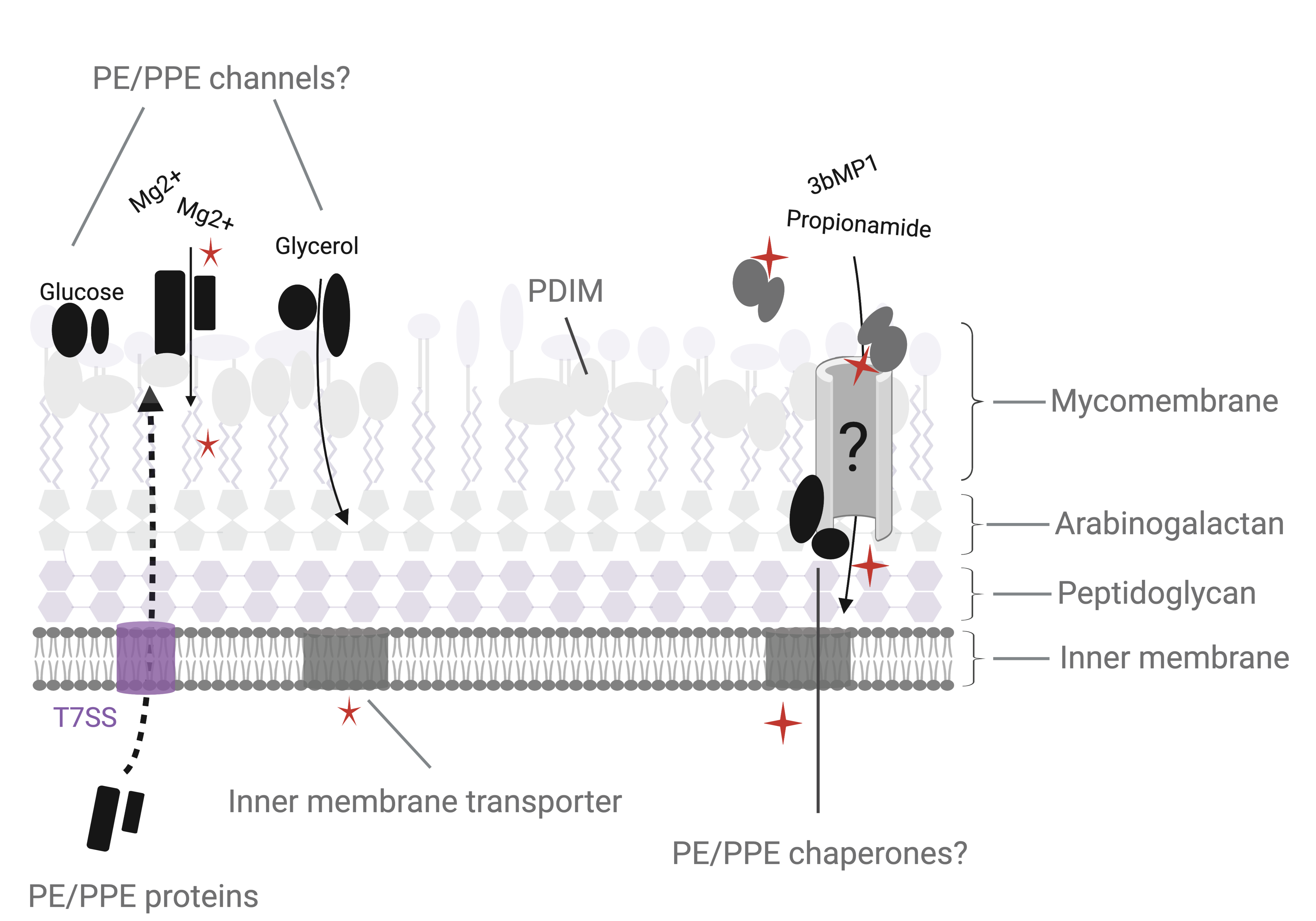 Gram-negative bacteria, which have a similarly restrictive outer membrane, rely on a variety of proteins (porins) spanning the membrane to allow key molecules to enter the cell (Fig 1A). However, few porins have been demonstrated for Mtb. In their work, Wang et al. propose that different combinations of PE/PPE proteins serve a porin-like function to channel diverse molecules into Mtb. The PPE/PE family genes, so named based on conserved Pro-Glu (PE) and Pro-Pro-Glu (PPE) motifs in their N termini, are unique to mycobacteria and are particularly expanded in pathogenic slow-growing mycobacteria, with more than 160 PPE/PE genes annotated in Mtb [5]. Previous work has found that PE and PPE proteins are secreted as heterodimers by Type VII secretion systems and can be localized to cell envelope fractions. As such, PE and PPE genes have been proposed to serve diverse functions including immune evasion through antigen variation and the import of different nutrients [6], but to date the broader function of PE/PPE genes have remained largely unclear.