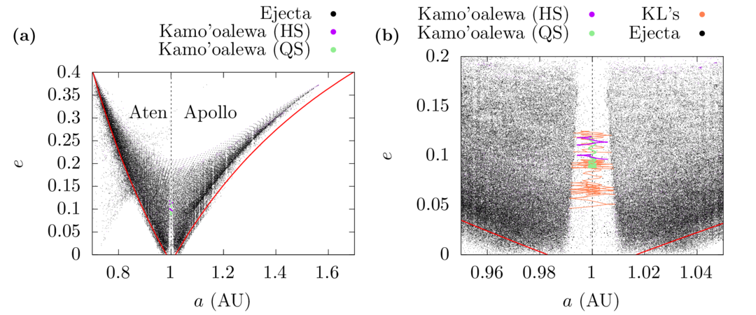 Our results show that most of the ejected particles achieve either Aten- or Apollo-like orbits, similar to typical near-Earth asteroids. In the diagram of orbital eccentricity versus semi-major axis, it can be observed how the outcomes face a dynamical barrier for entry into the region with a=1 au, that is, the co-orbital region. This barrier is however slightly porous (likely because of the small forces from the distant planets), and in our simulations a small fraction of particles, denoted as Kamo`oalewa-like (KL) particles, reached this region and showed persistent HS-QS transitions.