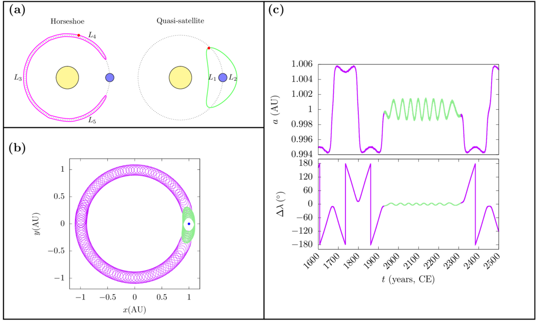 Kamo`oalewa is currently classified as an Earth's quasi-satellite (QS). Although a few other quasi-satellites of Earth are known, Kamo`oalewa is the most stable among them. Orbital computations indicate that it will remain in this kind of orbit for centuries. These simulations also show that when departing this orbit, it will move to a related type of co-orbital motion, known as a horseshoe (HS) orbit, only to later return to the quasi-satellite state in a few centuries (see video below). Kamo`oalewa’s HS-QS transitions persist for millions of years, both in the past and in the future. Asteroids co-orbiting with Earth for such long timescales are uncommon.