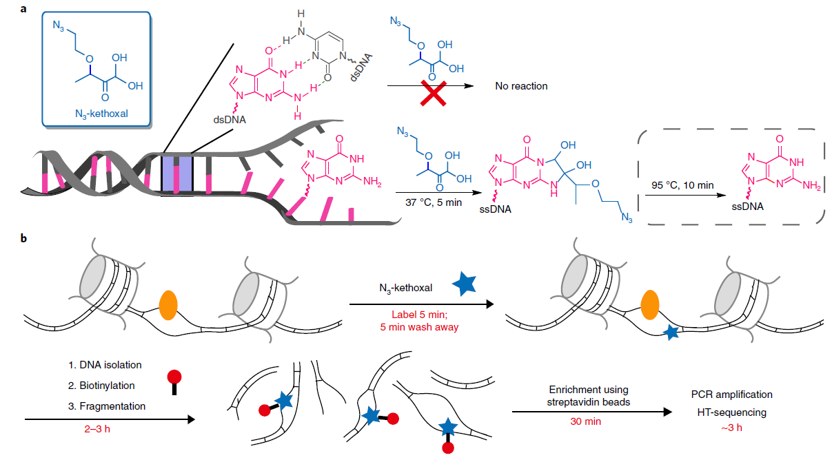 Tong joined our lab as a graduate student when N3-kethoxal was first made, and he helped develop the keth-seq method. He reasoned that N3-Kethoxal should also show the same reactivity with guanines in ssDNA as in ssRNA, and the formation of Watson-Crick base-pairing in dsDNA can block this reaction(Fig. 1a). This property could enable a method to detect ssDNA in situ. From Keth-seq work Tong already knew that N3-kethoxal labeling can be reversibly removed by heating at 95 ˚C, so he could avoid issues with the kethoxal label interfering with PCR amplification. Following his experiences from the keth-seq project, Tong tried a modified protocol by labeling HEK293T cells, isolating genomic DNA instead of RNA, performing biotinylaiton and enrichment, and constructing DNA libraries for next generation sequencing. Overall, the entire protocol was simple and he was able to finish within one day(Fig. 1b).