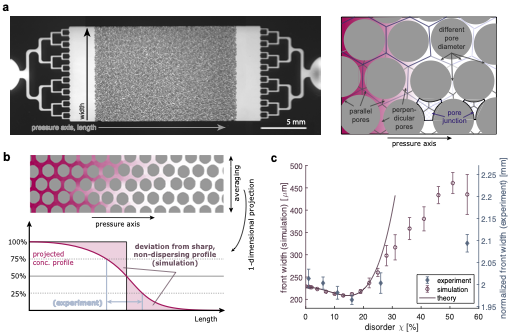 Fig. 1. The dispersive front width is a non-monotonic function of porous medium disorder. a Experimental setup. b Definition of the dispersive front width. c Experiments, simulations, and an analytical theory predict a non-monotonic dependence between porous medium disorder and porous medium disorder. Taken from [2]