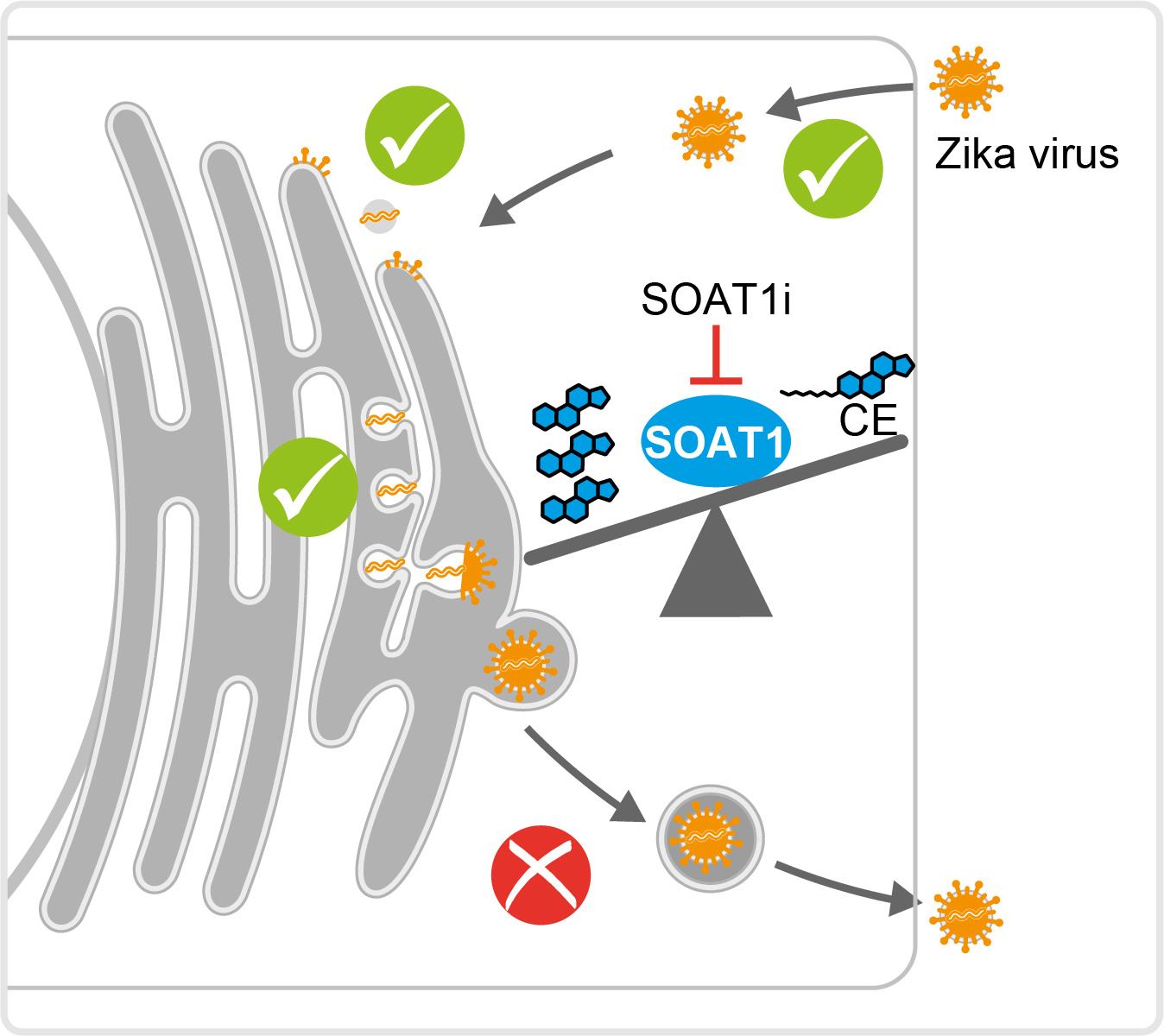 To sum up, we observed that blocking the activity of the cholesterol-esterifying enzyme SOAT1 reduces Zika virus infection. This is likely due to an imbalance between cholesterol and cholesterol ester that creates a disadvantageous lipid environment for virus particle morphogenesis.