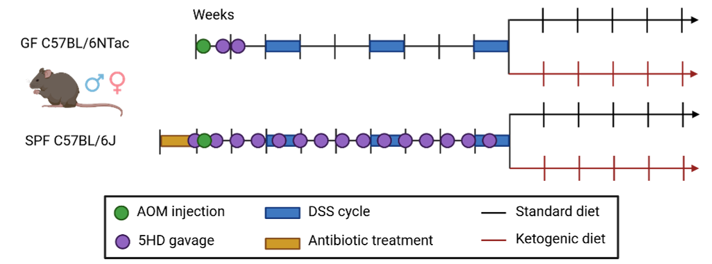 Figure 1. | Experimental design. Humanization of the murine gastro-intestinal tract, followed by the induction of colorectal cancer. Created with Biorender, from Tsenkova et al. 2025.