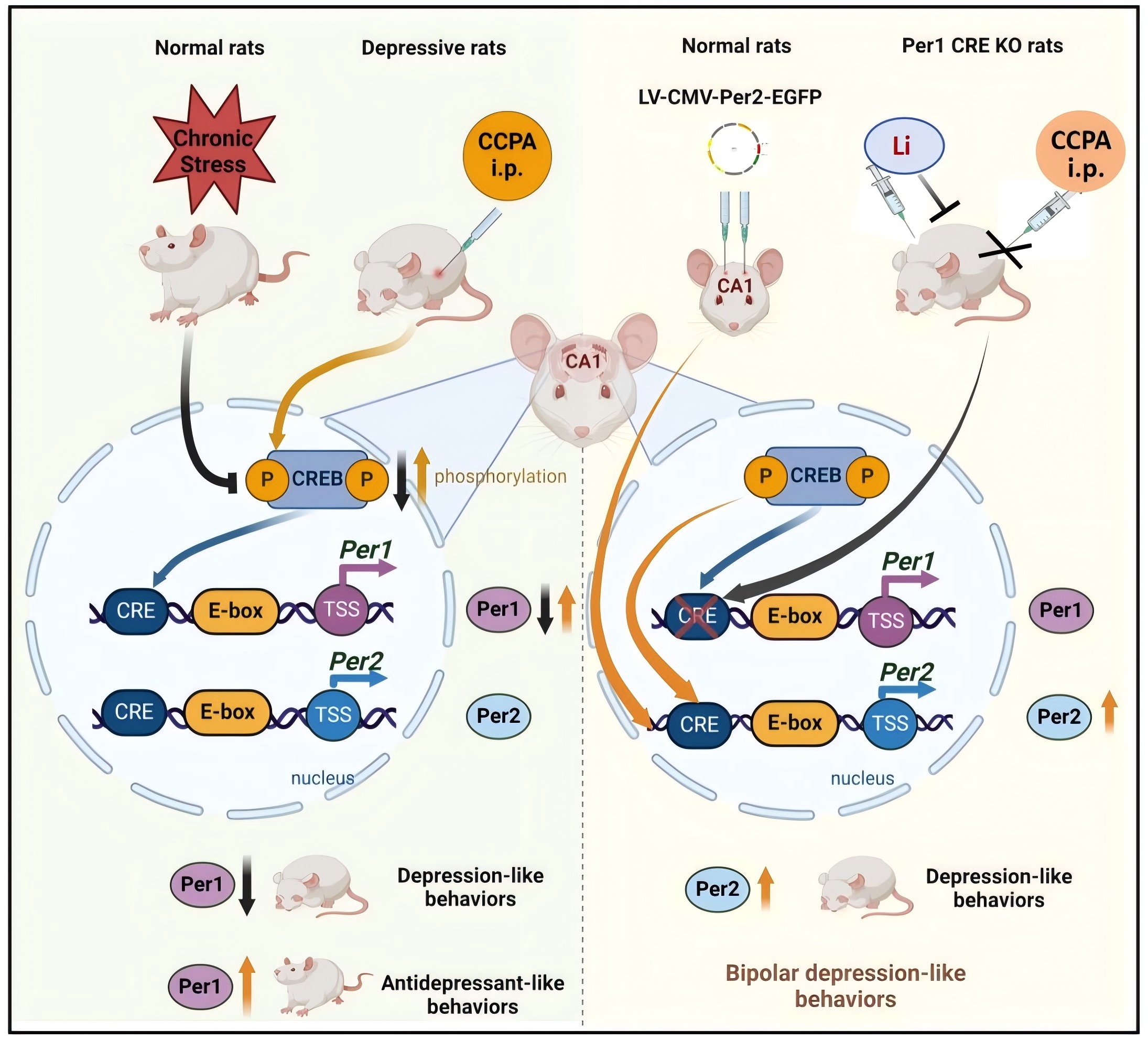 The cAMP response element-binding protein (CREB) and Period1 (Per1) have been implicated in depression, but their interactive mechanisms remain unclear. This study investigated the integrative role of CREB and Per1 in depression and explores a potential strategy for rapid antidepressant treatment. Using a chronic unpredictable stress (CUS) model, we conducted behavioral assessments including the sucrose preference test, forced swimming test, elevated plus maze, and open field test. Gene expression was manipulated via stereotaxic surgery and RNA interference (RNAi), while protein levels and viral injection sites were verified through Western blot analysis and immunofluorescence. Additionally, we generated Per1 CRE knockout rats using CRISPR/Cas9, with genotypes confirmed by Sanger sequencing. CUS significantly reduced phosphorylated CREB (pCREB) and PER1 levels in the CA1 region. Both Per1 knockdown in CA1 and CRE sequence knockout induced depression-like behaviors, whereas Per2 knockdown in CA1 produced mania-like behaviors. Notably, CRE knockout in the Per1 promoter increased pCREB binding to the Per2 promoter, upregulating PER2 expression in the CA1 and resulting in depression-like phenotypes that are partially lithium-responsive. Treatment with the adenosine A1 receptor agonist 2-chloro-N6-cyclopentyladenosine (CCPA) elevated pCREB and PER1 levels in the CA1 and elicited rapid antidepressant effects. These effects were present in heterozygotes but absent in homozygotes with a mutated Per1 CRE sequence. These results revealed the pivotal role of the pCREB-CRE-Per1 pathway in CUS-induced depression and its mediation of rapid antidepressant-like effects via adenosine A1 receptor activation. Moreover, the CRE sequence in the Per1 promoter may be a critical molecular link to the pathophysiology of bipolar depression.