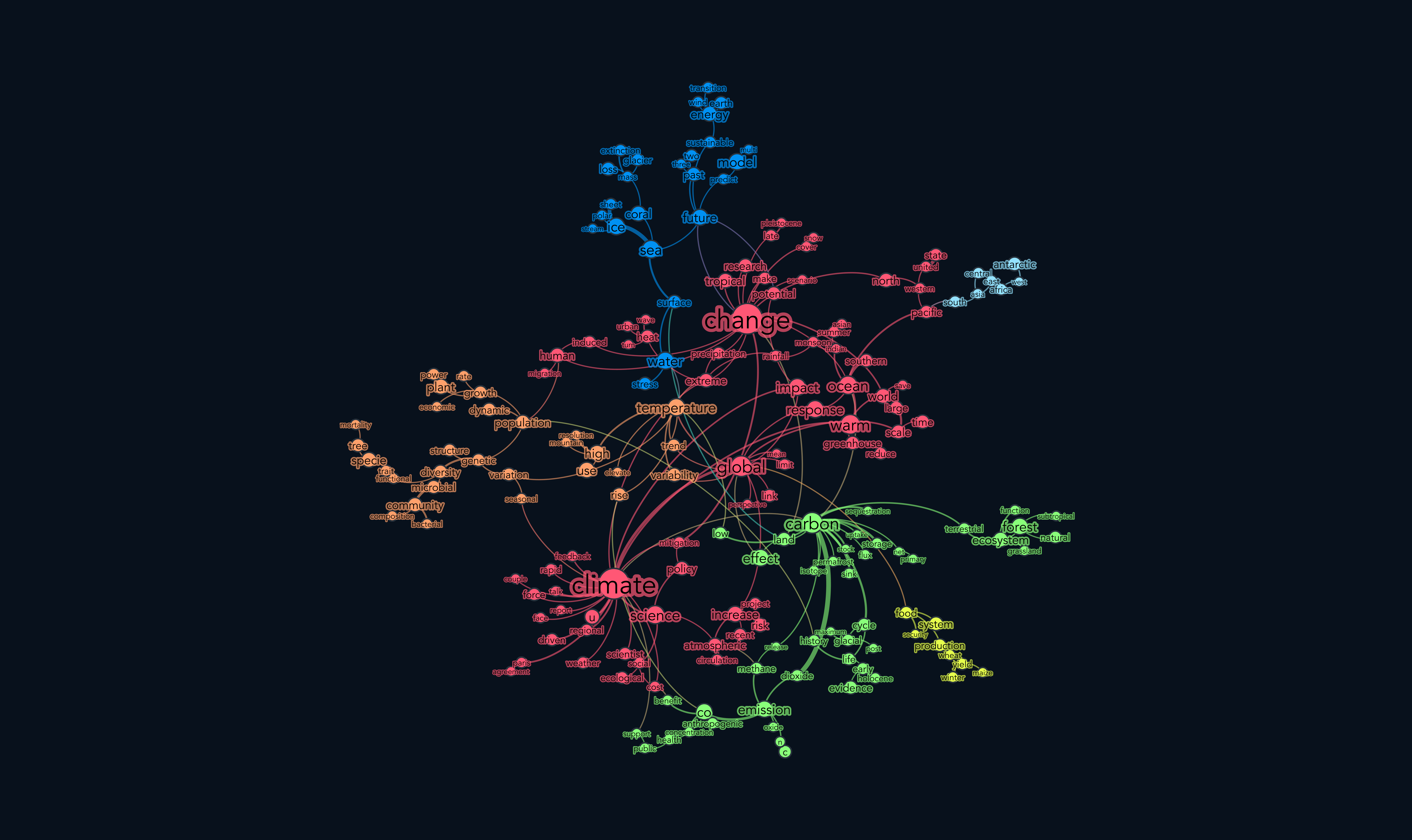 To overview the current landscape of climate change research, I collected all the related article titles from nature.com. These include more than twenty thousand research articles, news, views, comments, and opinions, dating back to 1861. During the last few decades, there has been an exponential boom in this line of research as well. For instance, the number of articles published in 2019 almost reached 2500, while in 2020, this number has already outmatched the annual total of 2009 at around 800 pieces.