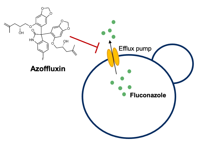The next step was to determine how this bis-benzodioxolylindolinone increased fluconazole activity against drug-resistant C. auris. One mechanism by which compound combinations improve each other’s activity is through increasing bioavailability. Thus, we tested the hypothesis that our hit compound was inhibiting efflux pumps, or transmembrane transporters that pump molecules, such as fluconazole, out of the cell. Through genetic and biochemical approaches, we determined that azoffluxin primarily inhibited the major efflux pump Cdr1, which resulted in increased intracellular fluconazole, and therefore greater efficacy. Consistent with this mechanism, we also determined that azoffluxin increased sensitivity of C. auris to an array of intracellular-acting compounds. Based on these findings, we promptly named this compound azoffluxin based on its ability to block “azole” “efflux” out of the cell.