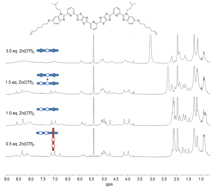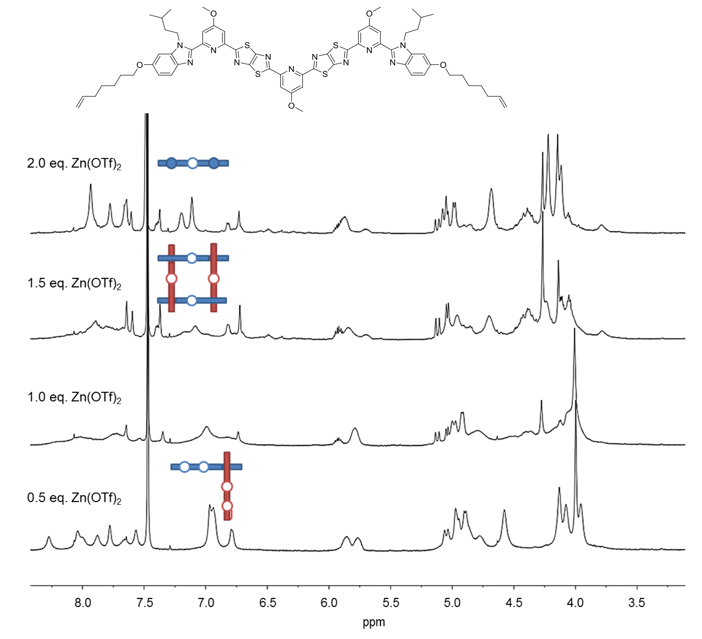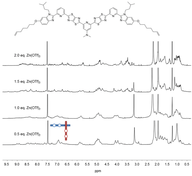 Fig. 4. 1H NMR (600 MHz, 298 K) spectra of titration of third ligand strand design with Zn(OTf)2 in CD3CN/CD2Cl2.
