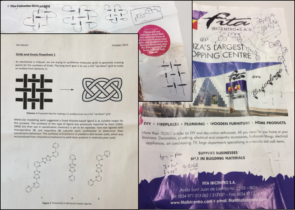 In 2011, Jon Beves, then a post-doc in my group (now an Associate Professor at the University of New South Wales), came up with the exciting idea of synthesising a molecular endless (74) knot from a woven 3x3 grid. The 74 knot is an iconic topology, a basic motif of Celtic interlace, the smallest Chinese knot, and one of the eight auspicious symbols (the Ashtamangala) common to many Eastern religions and philosophies, where it represents the union of wisdom and method. It is also the basic repeat unit of a plain weave, the most basic weaving pattern for fabrics. Clearly its synthesis would open up new research directions and possibilities in materials science. Jon's original sketch for the concept (on pages torn from a 2011 RyanAir magazine!), together with the first design we worked on (developed by Jon and then-PhD students Jean-François Ayme, Chris Campbell and Jon Danon during our annual group conference, at that time held on the shores of Loch Tay in Scotland), are shown below in Figure 1.