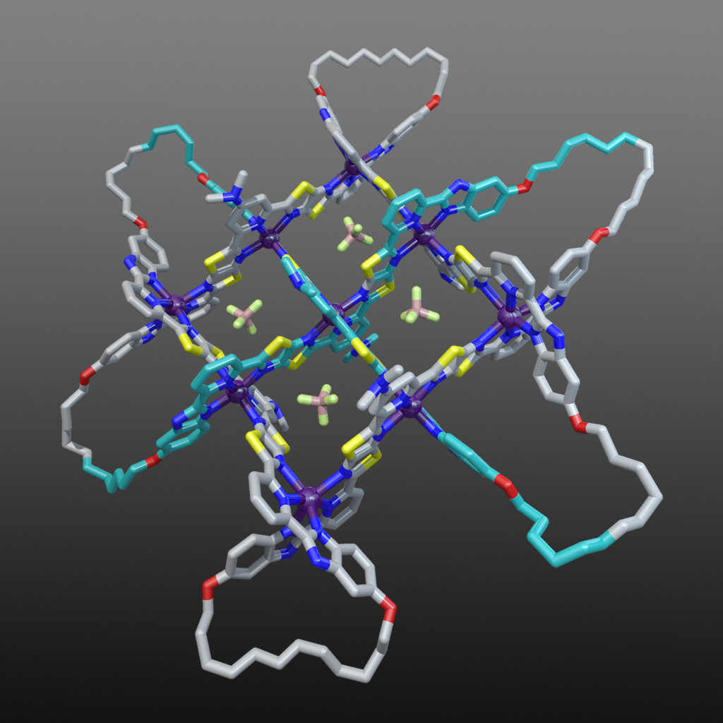 The X-ray crystal structure of the interwoven 3x3 grid confirmed its architecture and ring-closing olefin metathesis subsequently afforded the 258-atom-long, closed loop, 74 endless knot (along with a simple macrocycle and a Solomon link). Figure 6 shows the structure of the 74 knot coordination complex (with 6 x Fe(BF4)2) based on the X-ray structure of the 3x3 interwoven grid with modelled cyclized end groups. The X-ray structure also showed the key role played by the BF4- anions: four of them bind in the square cavities formed between the criss-crossed coordinated ligand strands (Fig. 6). The binding energy provided by those interactions are sufficient to stabilize the entire structure to the extent that the formation of the woven grid becomes favourable.