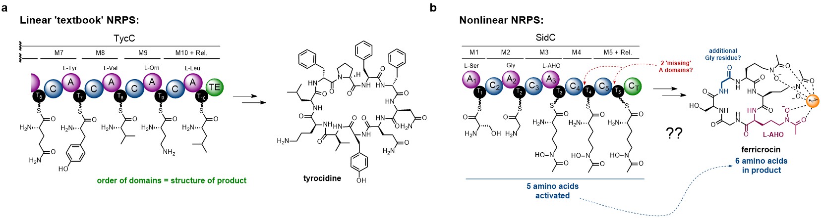 In bacteria, NRPS enzymes tend to exhibit a colinear relationship between the order of enzymatic domains and the final product. This, combined with the ability to predict the individual amino acids from the primary sequence of each adenylation (A) domain, allows prediction of peptide structure from sequence data alone. The tyrocidine NRPS is a good example of a ‘textbook’ NRPS system (Fig. 1a). In contrast, fungal NRPSs exhibit unusual characteristics that make understanding their biosynthetic logic more challenging. Firstly, prediction of A domain specificity from sequence data is not possible in fungi – suggesting different evolutionary origins. In addition, modules lacking dedicated A domains are commonplace, implying that the thiolation (T) domain must be loaded by an A domain from a different module. Further complicating matters, the sequence of the peptide product often doesn’t correlate to the order of domains, suggesting nonlinear behaviour. The SidC NRPS is a perfect exemplification of all these unusual features (Fig. 1b).