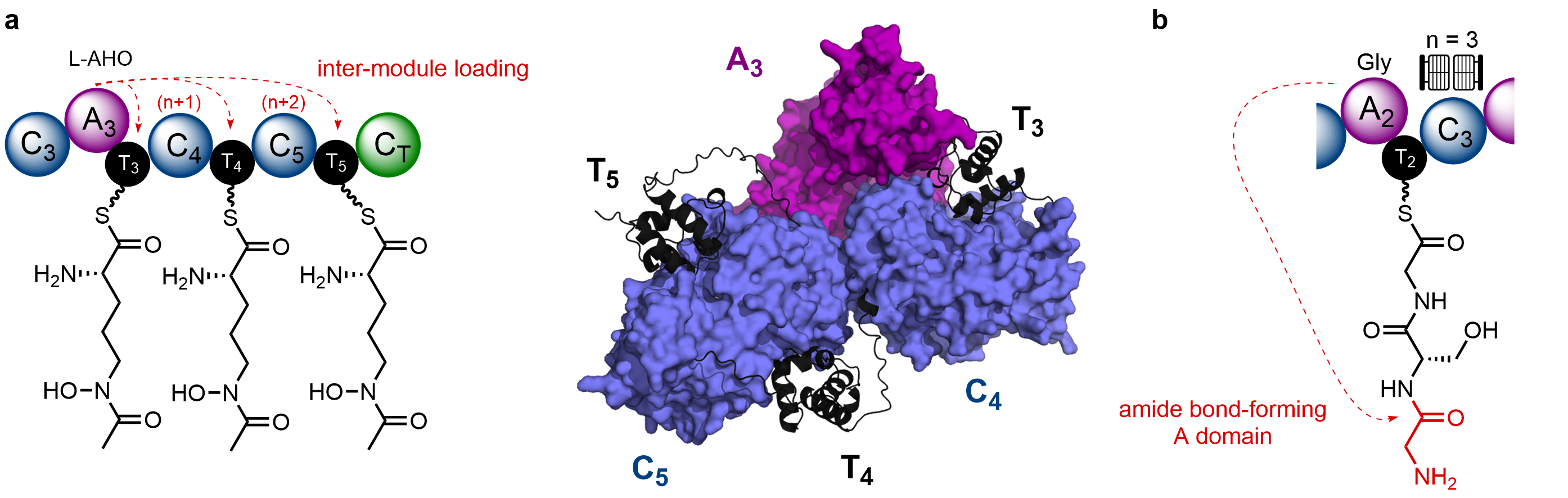 Figure 2. Cryptic programming events in the SidC NRPS. a). The A3 domain loads L-AHO to the T3 domain (intra-modular), in addition to the T4 and T5 domains (inter-modular). An AlphaFold model of the A3T3C4T4C5T5 region suggests close packing between the A3 domain and C4/C5 domains allows substrate transfer to the T domains. b). The A2 domain catalyses amide bond formation with the terminal NH2 group, to form a three-residue chain. The downstream C3 domain acts as a gatekeeper for this process.
