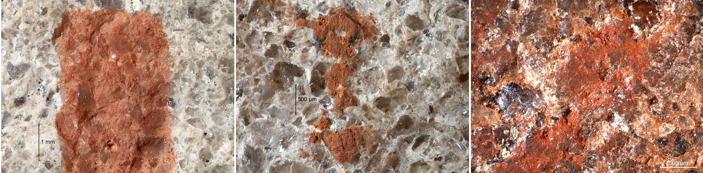 During analysis, we noticed that the surface on which the lines were drawn on looked particularly smooth and slightly curved relative to the other surfaces. To investigate this further, Alain Queffelec, also at Bordeaux, used a confocal microscope to analyse the roughness of all surfaces of L13, as well as on the knapped and cortical surfaces of the silcrete flakes used in the experiments. The results, coupled with areal fractal analysis, show that the surface with the drawn lines is in fact significantly smoother than the other measured surfaces, and this smoothness cannot be due to natural processes. This, along with the presence of microscopic traces of ochre on the surface (outside of the lines), clearly showed that L13 was flaked from a grindstone that was used to grind ochre, before the drawing was made. As the lines on L13 are truncated, the original drawing must have extended over a larger area of the grindstone, although we have not yet found the other parts of the grindstone.