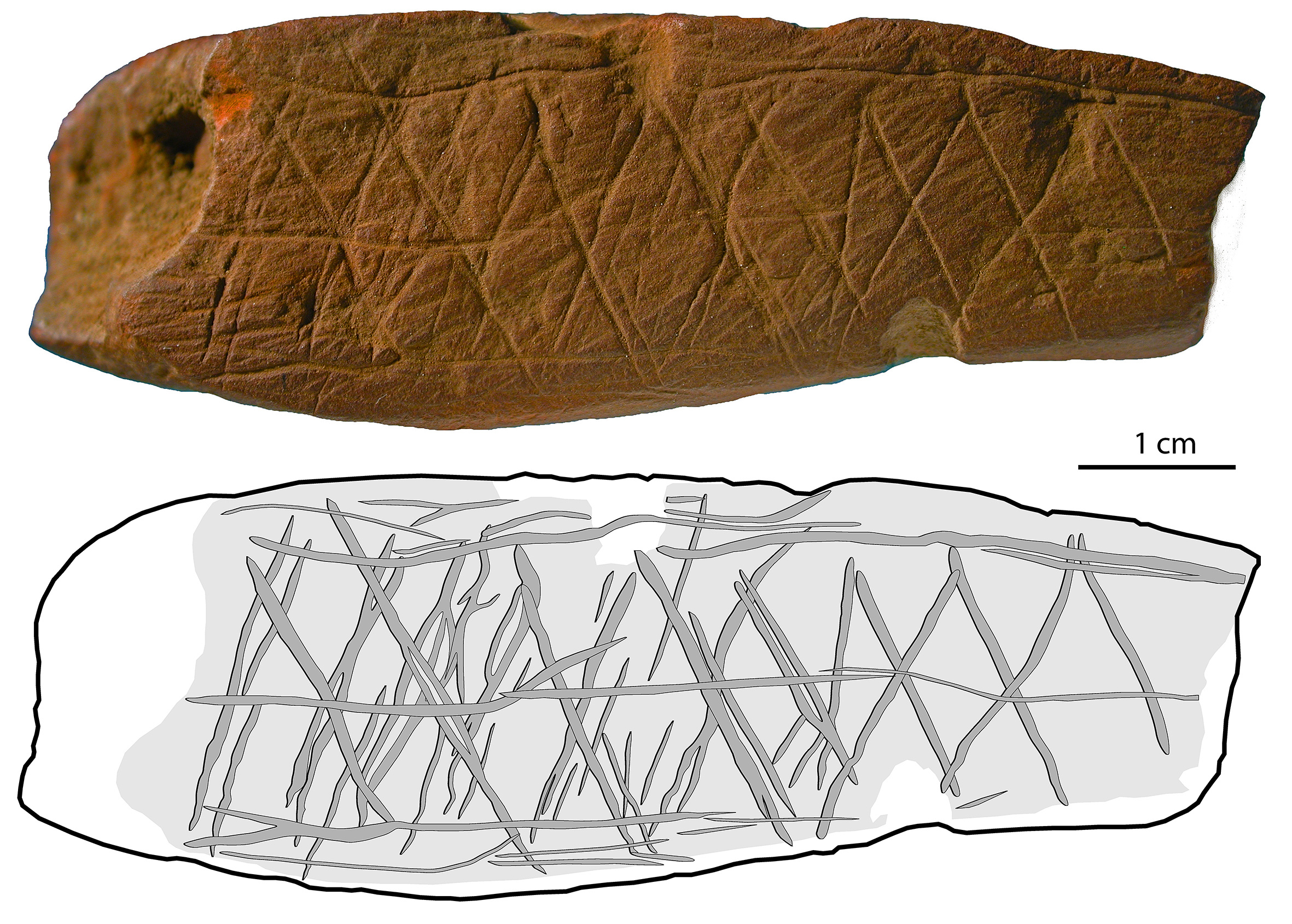 Our results indicate that the lines on L13 have been deliberately drawn with a pointed ochre pencil, which makes this pattern the earliest known drawing, preceding by at least 30,000 years previous examples. But there is more. The archaeological layer in which L13 was found has yielded other indicators of symbolic thinking such as shell beads covered with ochre, and, more importantly, pieces of ochres engraved with abstract patterns. Some of these engravings closely resemble the one drawn on the silcrete flake, L13. This demonstrates that early Homo sapiens in the southern Cape used different techniques to produce similar signs on different media. This observation supports the hypothesis that these signs were symbolic in nature and represented an inherent aspect of the spiritual world of these African Homo sapiens.