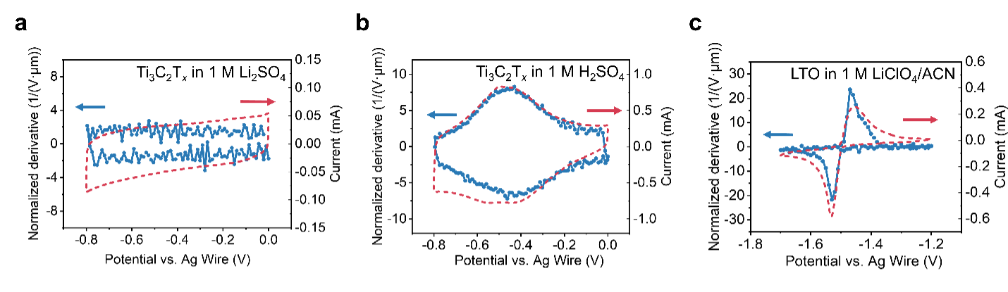 In our article In Situ Monitoring Redox Processes in Energy Storage Using UV-Vis Spectroscopy in Nature Energy (https://rdcu.be/c9kEA), we investigated Ti3C2Tx MXene in neutral aqueous electrolyte for electrical double-layer and in sulfuric acid for pseudocapacitance, and lithium titanate (LTO) in a lithium perchlorate in acetonitrile electrolyte for battery-type redox mechanisms. We used two methods to collect UV-Vis absorption data. One applied constant potential step by step to the device, waited to reach the equilibrium state, and collected the full spectra in the UV-Vis range. The other involved running cyclic voltammetry (CV) while collecting the absorption at certain fixed wavelengths. Figure 1 shows optical CVs (blue curves) derived from UV-Vis data matched electrochemical CVs (red curves). This illustrates that the UV-Vis absorbance change of electrode material is highly responsive to the change in the state of charge, making UV-Vis spectroscopy a promising technique for studying redox processes in energy storage systems.