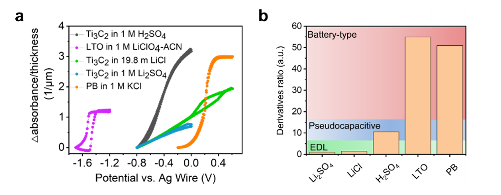 Then we extrapolate this method to other systems like Prussian Blue (PB) in potassium chloride and MXene in water-in-salt electrolyte to further compare different energy storage processes. We demonstrated that Ti3C2Tx MXene behaves like a double-layer capacitor in a water-in-salt system. In general, battery-type systems have steeper slopes, as seen in the purple and orange lines in Figure 2a. Double-layer systems (green curves) have gentler slopes, while the pseudocapacitive system (black curve) falls in the middle. By calculating the derivative ratio from the optical CVs, one can determine which kind of energy storage mechanism is compared to others for a given system, as shown in Figure 2b.