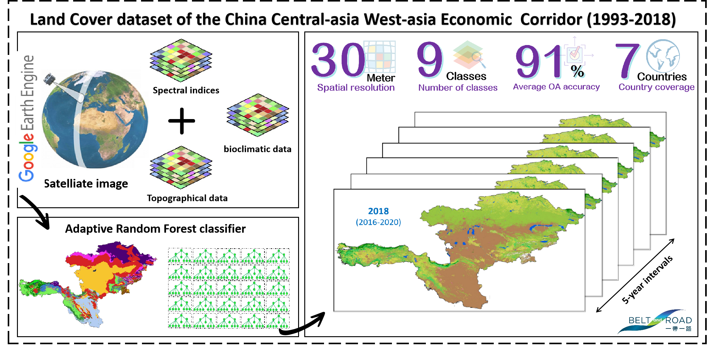 Our study focused on the China Central-Asia West-Asia Economic Corridor, a crucial component of the Belt and Road Initiative (BRI) program, spanning eight countries in arid and semi-arid climates. This region had been witnessing severe land cover changes, exemplified by the Aral Sea crisis and the shrinkage of Lake Urmia. The Aral Sea, in Central Asia, had lost over 80% of its surface area in recent decades, and Lake Urmia in Iran had similarly shrunk by 80% since 2000. These drastic changes posed a significant threat to both human lives and ecosystems, necessitating a precise long-term land cover dataset for the entire corridor. Unfortunately, aside from China, such a dataset was conspicuously absent for the other countries in the region.
