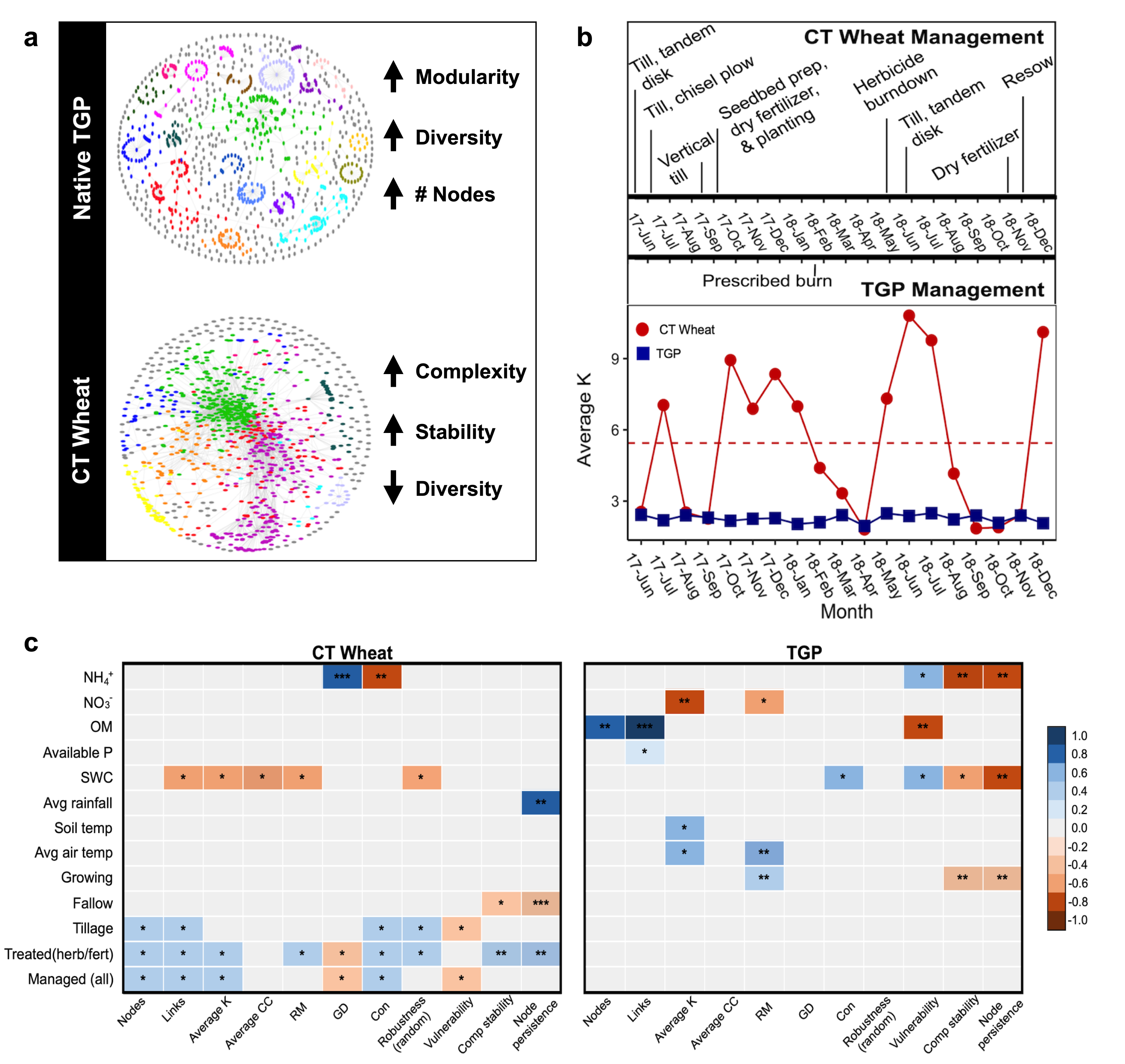 The MENs under CT wheat land use displayed noticeable variation in network structure compared to the native TGP. The majority of the TGP network topological properties stayed stable over the 19 months, while there were obvious temporal variations for CT networks that coincided with times of management. While the native TGP microbial community was more diverse and the networks were larger, the resulting networks were less complex than that of CT wheat. This could arise from more diverse nutrient sources, greater functional redundancy, or stronger niche differentiation.
