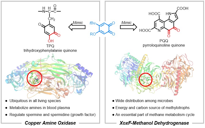 Quinoproteins are recognized as the third redox enzyme besides pyridine nucleotide- and flavin-dependent proteins which own a quinone cofactor enabling amine and alcohol oxidation. Several years ago, we have developed bio-inspired ortho-quinone catalysts with the cofactor of copper amine oxidase, TPQ as a blueprint for the oxidation of amines. Our simple and efficient ortho-quinone could not only oxidize primary amine, even α-branched primary amine, but also secondary amine and tertiary amine which are inert substrates for copper amine oxidase. After we disclosed the reaction pathway of amine oxidation, we turned our sight into another quinoprotein—methanol dehydrogenase. Methanol dehydrogenase (MDH) are common in methylotrophic bacteria and provide carbon and energy for bacteria by oxidizing methane and methanol. Due to the different metals employed in the active site, MDH could be divided into two parts: Ca-MDH and Ln-MDH. The central metal could improve substrate affinity, polarize the carbonyl group of the quinone cofactors and stabilize the negative charge intermediate. Hence the Ln-MDH with lanthanide as central metals owning strong Lewis acidity, high coordinate numbers and abundant are more spread and exhibit higher oxidation ability than Ca-MDH. Due to the methanol oxidation solely occurred on the PQQ cofactors, there are many biomimic PQQ model compounds designed to investigate their redox property since the discovery of PQQ. However, these compounds are hard to synthesize and their catalytic efficiency are too low to be employed in organic synthesis. Hence, developing more efficient and simpler quinone catalysis for alcohol oxidation remains a worthy goal.