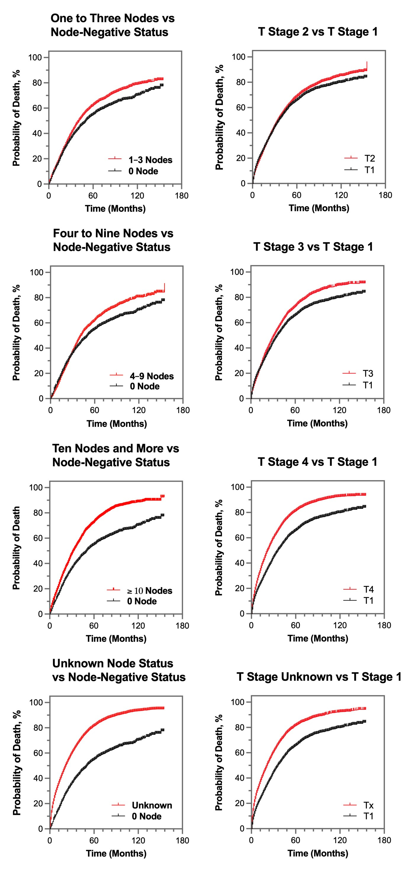 We found that death was significantly higher in metastatic breast cancer patients with 1 to 3 nodes, 4 to 9 nodes, ≥10 lymph node involvements, and node status unknown, respectively, than node-negative patients (Figure image). Importantly, the association of nodal involvements with death was independent of age, race, tumor grade, estrogen-receptor status and HER2 status as well as chemotherapy, radiotherapy and surgery. In addition, death was significantly higher in patients with T stage (T) 2, T3, T0, T4, and Tx, respectively, than T1 patients (Figure image). They all but T0 are independent of other clinicopathologic and treatment factors. We also demonstrated the association between T stage or axillary lymph nodes and the death risk in HR+/HER2–, HR+/HER2+, HR–/HER2+ and triple-negative metastatic breast cancer subtypes.