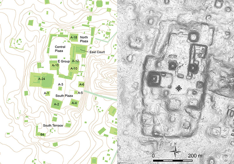 The layout of this site became clear through the use of lidar, or airborne laser scanning. Under the coordination of Juan Fernandez-Diaz of the National Center of Airborne Laser Mapping (NCALM), a small airplane equipped with a laser instrument flew over our study area, creating a highly accurate three-dimensional model. Some laser pulses penetrate the forest canopy and show archaeological features hidden under trees. Lidar is revolutionizing the archaeology of densely-forested regions, including the Maya area, Southeast Asia and Amazonia1. The discoveries of new sites in the jungle with lidar often catch media attention, but another important benefit of lidar is that it can reveal large horizontal patterns, which are difficult to recognize from the ground level.