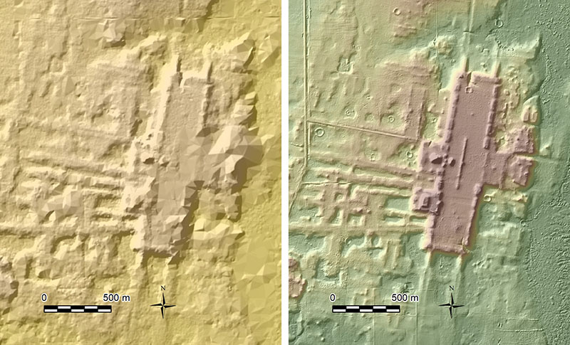 We learned about this advantage of lidar before we came to Aguada Fénix when we were working at the site of Ceibal, Guatemala, located in the protected rainforest. Ceibal is a well-known Maya site, which was originally investigated by Harvard University in the 1960s. We re-examined this site from 2005 through 2017, focusing on its early occupation to study the origins of Maya civilization. The archaeological map made by Harvard researchers showed multiple pyramids and platforms standing on what appeared to be a natural plateau of an amorphous shape. It was not until we conducted a lidar survey in 2015 that we realized that this basal plateau was an artificial construction made according to a specific design. Like Aguada Fénix, this was one of the early monumental constructions in the Maya area, dating back to 950 BC2, 3.