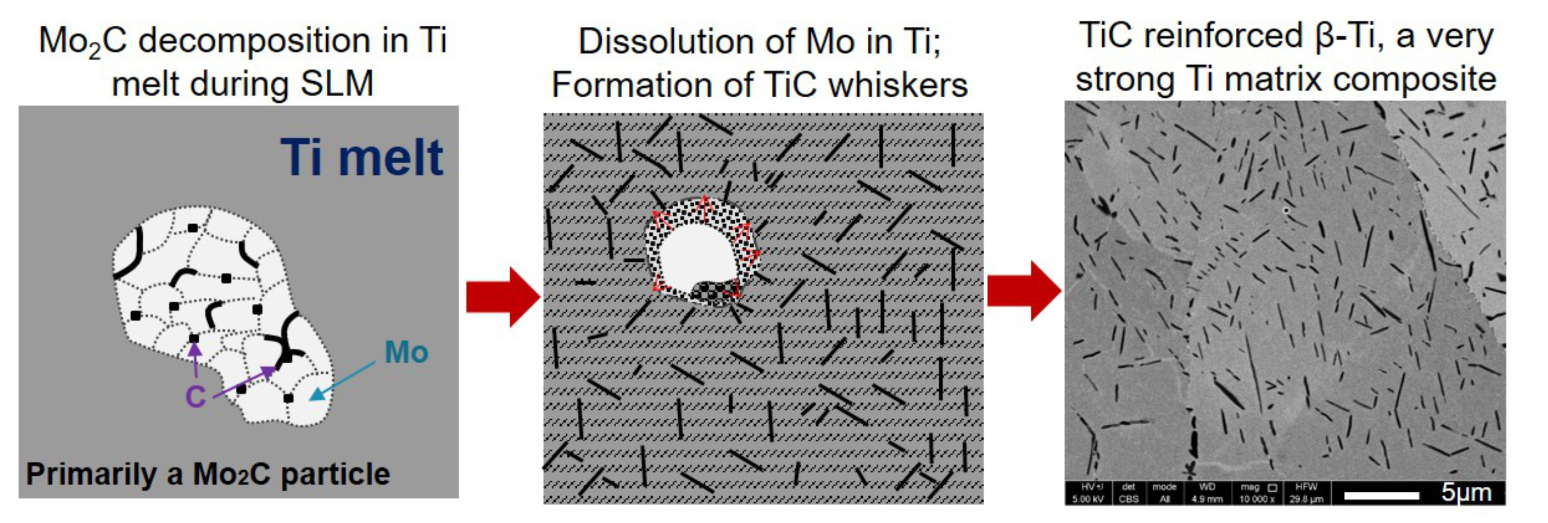 Figure 1: Schematic transformation of Mo2C particles in Ti during laser melting, resulting in a Mo dissolved β-Ti matrix reinforced by fine but long TiC whiskers. This occurs via decomposition of secondary Mo2C particles and diffusion of the products.