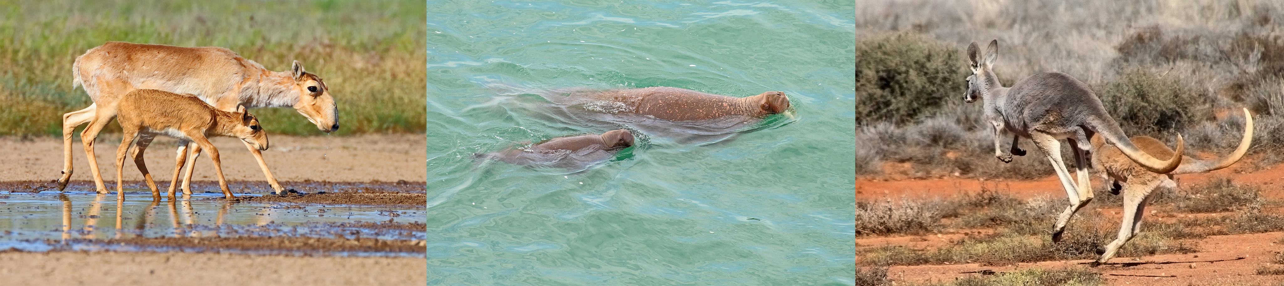 Mothers with infants of some of our subject species: saiga antelope (left), Pacific walrus (middle), and red kangaroo (right).