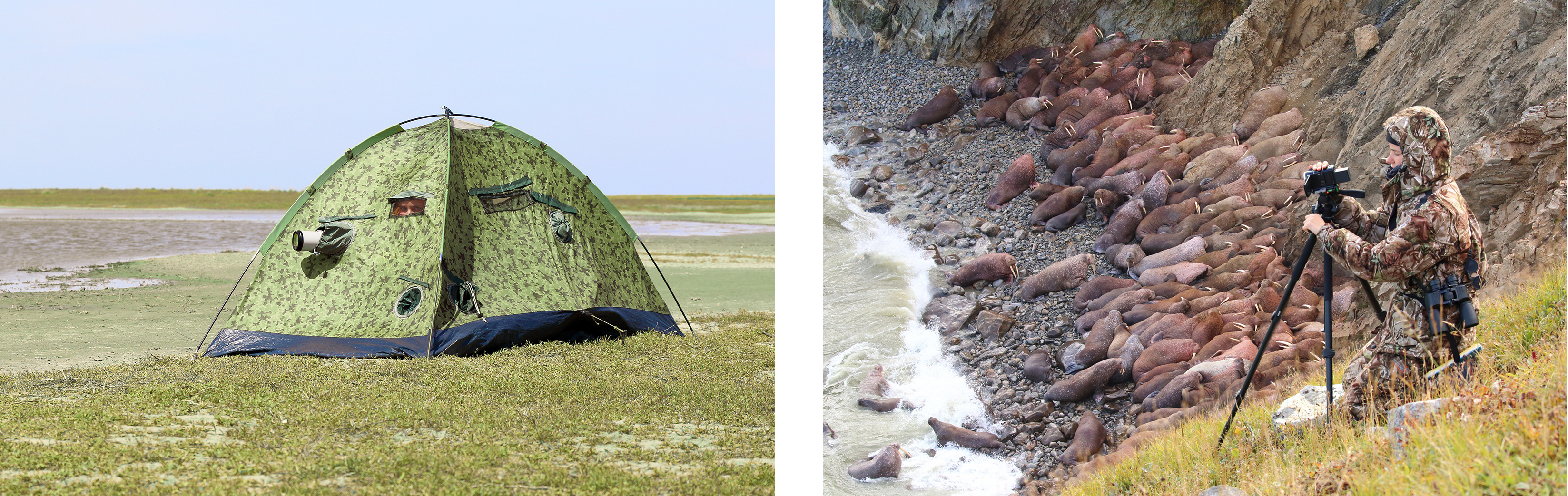 Left hand image: A hand-made hide for observations of saiga antelopes near a waterhole at Stepnoi Nature Reserve, Russia. Right hand image: Video recording of Pacific walrus mothers with calves in shallow water near the haul-out on Kolyuchin Island, Chuckchi Sea, Russia. Data collection was carried out from a 60 m cliff above a haul-out, and the animals showed no response to the observers and seemed to be unaware of their presence.