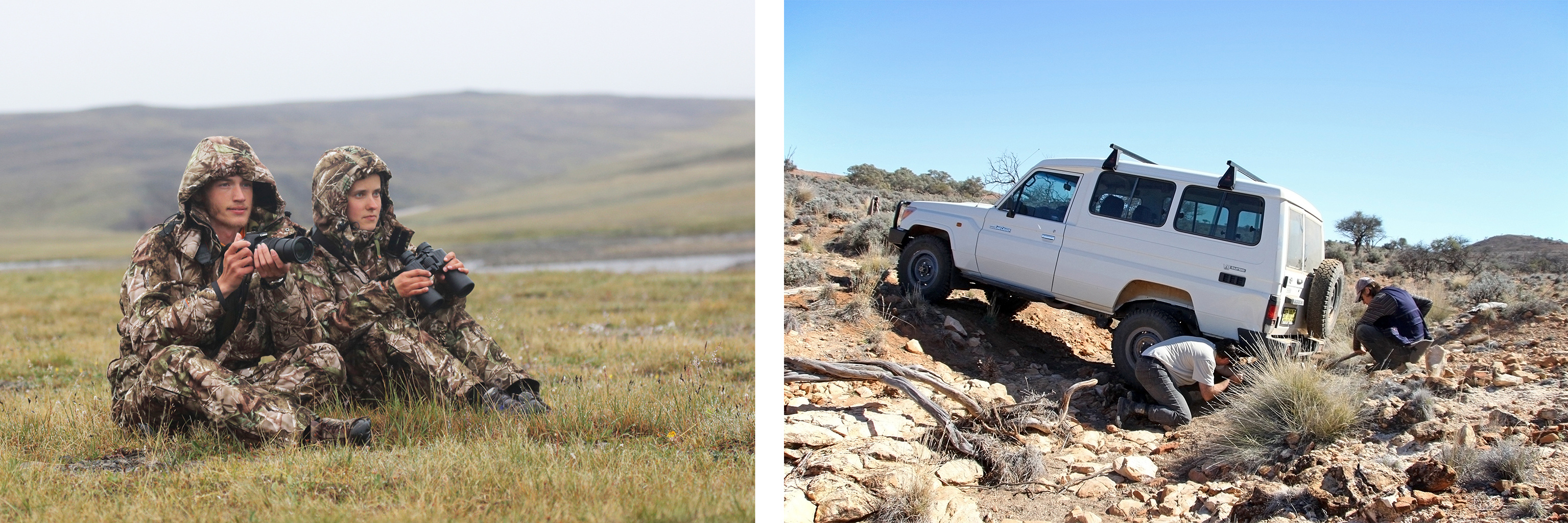 Dr. Karina Karenina). Right hand image: Not the most fruitful day of red kangaroo observations. In the photo: A/Prof. Yegor Malashichev (under the truck) and Andrey Giljov (right).