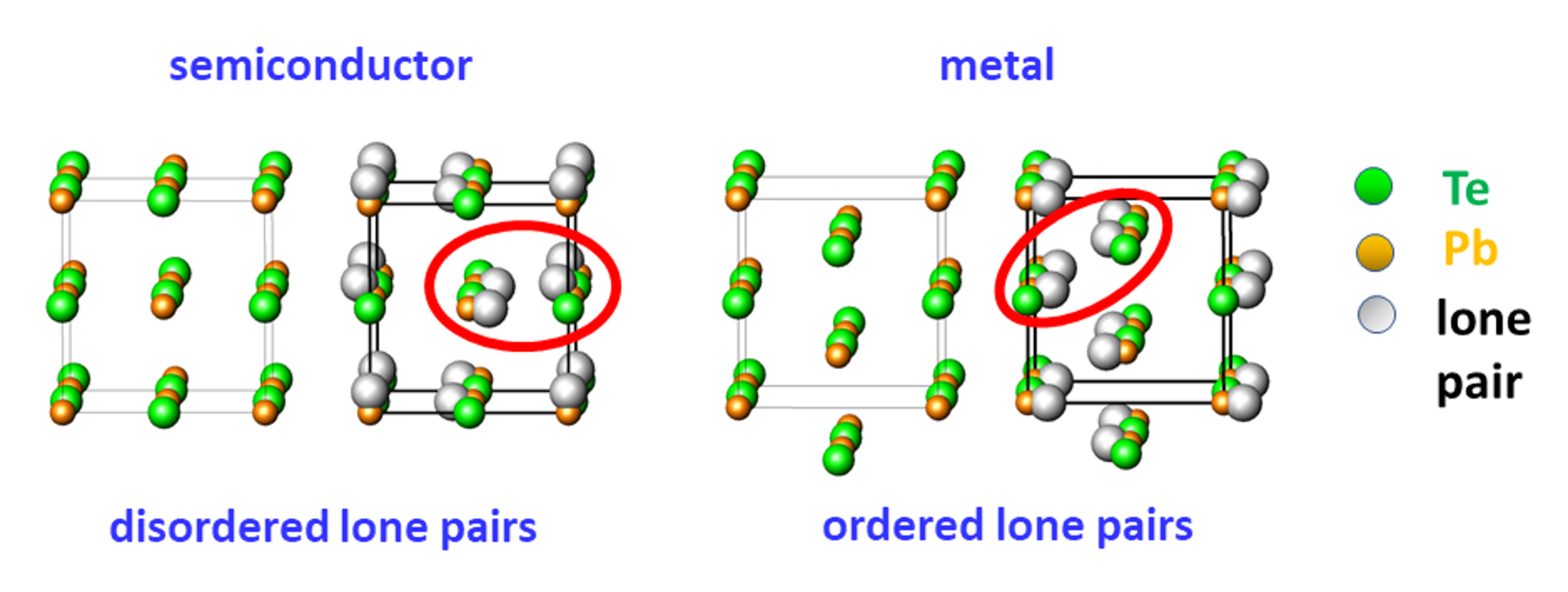 The shifts of atomic slabs perpendicular to {100} are caused by ordering of the stereochemically active lone- pairs on lead atoms below the characteristic value of 230 °C [Fig.2]. This causes changes in the electronic structure. The gap in the band structure of the ideal PbTe rock salt-type structure closes, and the material behaves like a metal in electrical transport measurements. Temperature increase above the characteristic value leads to a lone-pair disorder, and the crystal structure recovers the NaCl lattice and becomes semiconducting.