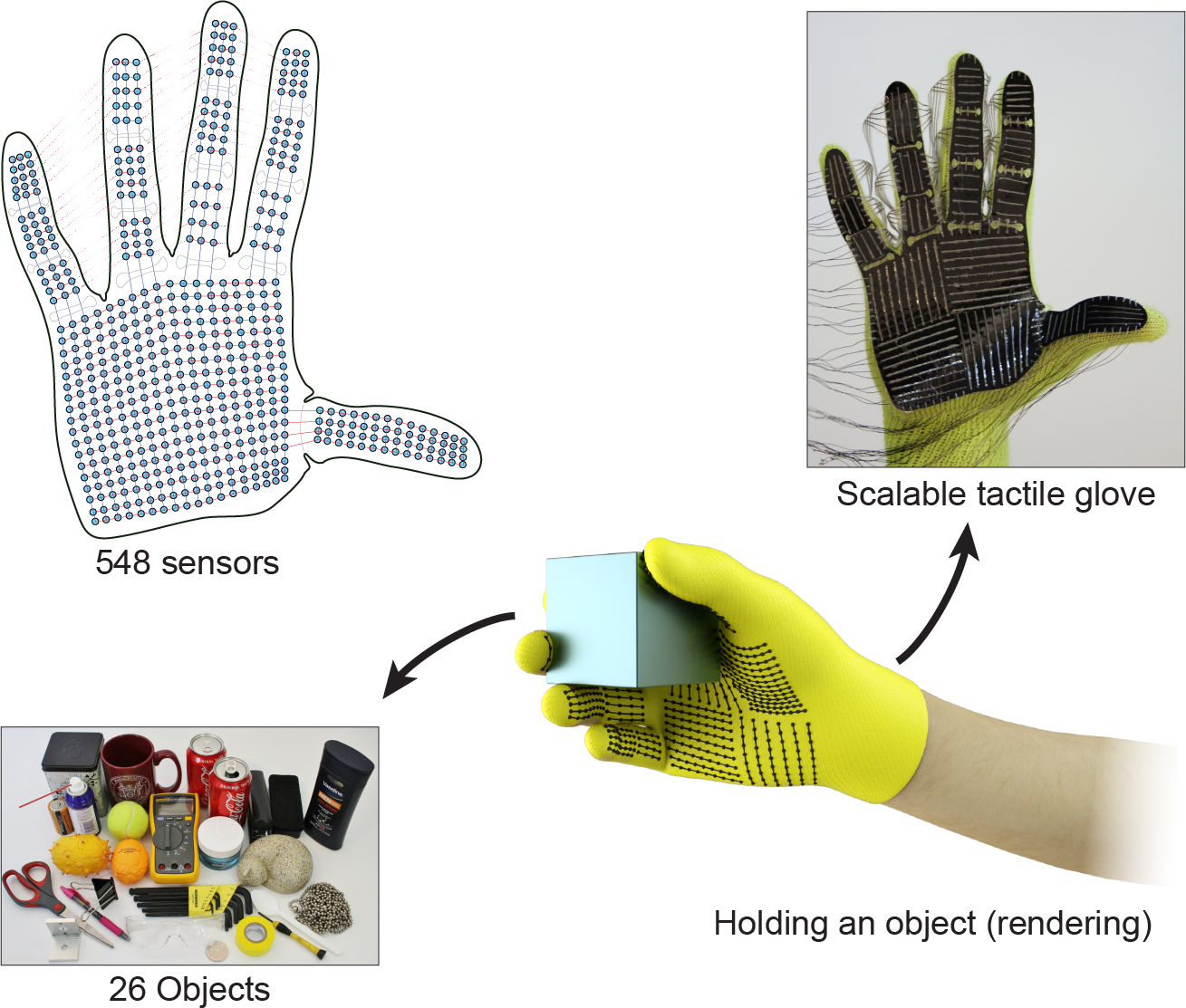 With this backdrop, we report a scalable tactile glove constructed using readily available materials and simple fabrication tools in a paper appearing in Nature. The glove consists of a sensing sleeve with 548 sensors that are uniformly distributed on the hand and respond to normal forces (see figure). Additionally, this sensor architecture can be readily translated to cover different surfaces, without size restrictions originating from the used fabrication methods. Using this tactile glove, we recorded a large-scale dataset of tactile maps (about 135,000 frames) each covering the hand while interacting with 26 different objects. We observed that using convolutional neural networks (CNNs) it was possible to identify objects or estimate their weights from the tactile information recorded during these interactions. The trained CNNs learned to look for simple geometric features like edges or pointed forces and were also activated by simplistic features of the grasp such as the use of a thumb. Finally, we were also able to look at the collaborative role of different regions of the hand when interacting with objects. This is generally known but it is now possible to quantify this purely from the collective set of object interactions.